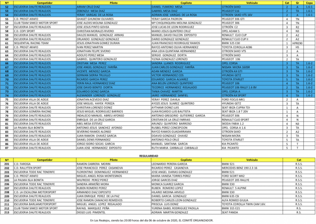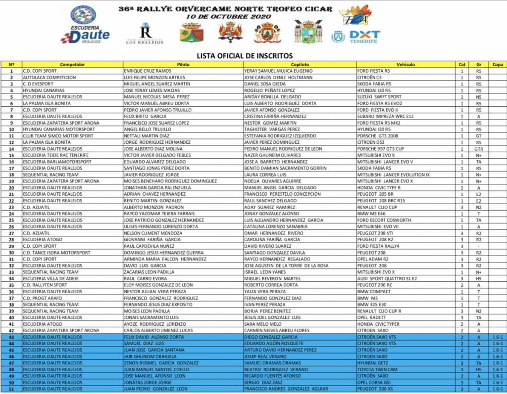 Publicamos la lista oficial de inscritos del Rally Orvecame Norte, que sola se puede catalogar se espectacular y donde el número 1 lo portarán Enrique Cruz – Yeray Mujica (Ford Fiesta R5), seguidos de Luis Monzón – José Carlos Déniz (Citroën C3 R5), Miguel Suárez – Dani Sosa (Skoda Fabia R5), Yeray Lemes – Rogelio Peñate (Hyundai i20 R5), Manolo Mesa – Ariday Bonilla (Suzuki Swift N5 R+), Víctor Abreu – Luis Alberto Rodríguez (Ford Fiesta R5), Pedro Javier Afonso – Javier Afonso (Ford Fiesta R5), Félix Brito – Cristina Fariña (Subaru Impreza WRC), Fran Suárez – Néstor Gómez (Ford Fiesta R5), Ángel Bello – Taghoter Vargas (Hyundai i20 R5), Neftalí Martín – Estefanía Rodríguez (Porsche 911 GT3), Jorge Rodríguez – Javier Pérez (Citroën DS3 R5), José Alberto Díaz – Pedro Manuel Rodríguez (Porsche 997 GT3 Cup), Víctor Delgado – Nazer Ghuneim (Mitsubishi Lancer Evo IX), , entre otros.
