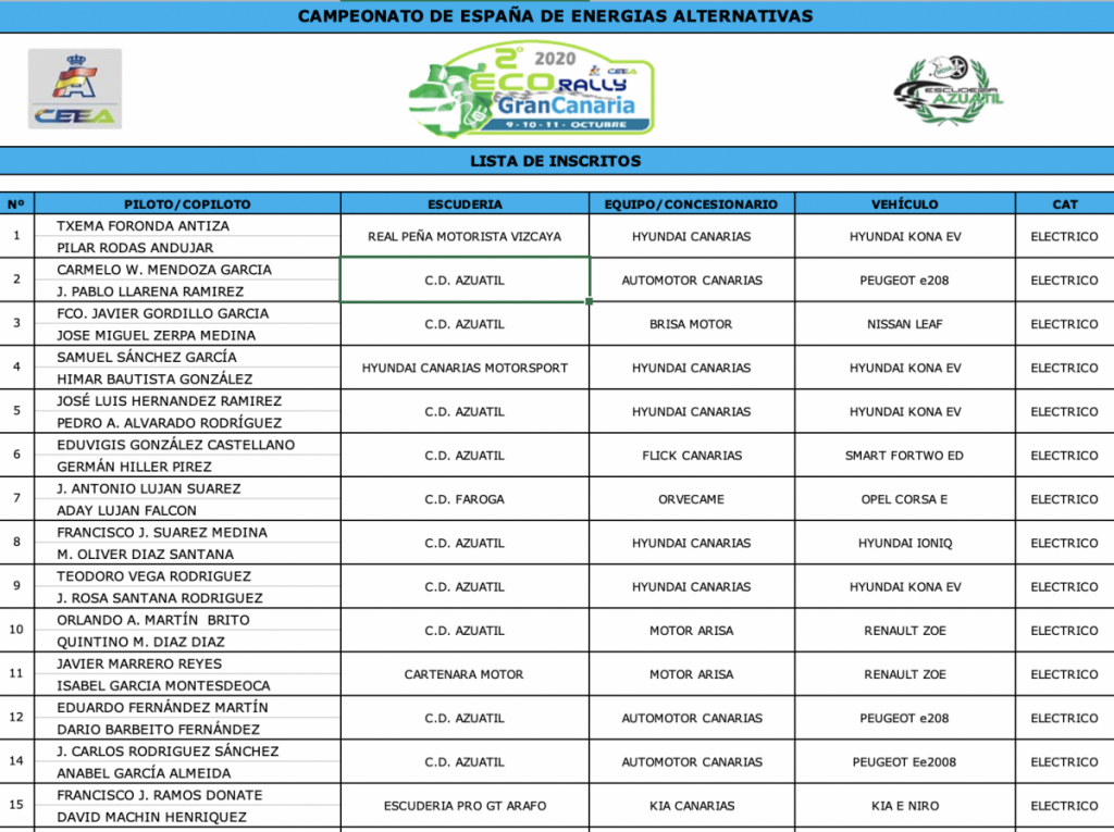 El CD. Azuatil está más que satisfecho con la respuesta de los equipos participantes en esta segunda edición del Eco-Rally Gran Canaria 2020 (9 al 11 de octubre), que contará con una lista de 27 equipos con sus correspondientes vehículos de energías alternativas, 17 unidades exclusivamente eléctricos y 10 con tecnología híbrida, que se suman a la corriente de la electrificación del automóvil del futuro.