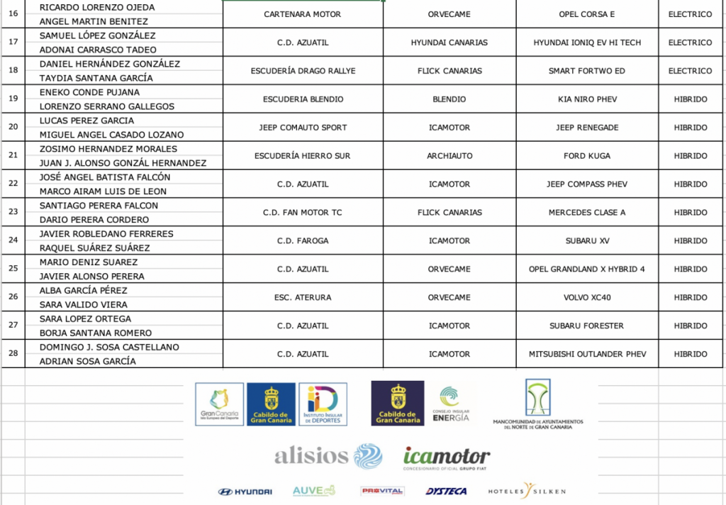 Tampoco falta participación femenina, como el equipo de Alba García-Sara Valido con un Volvo XC40, o Sara López-Borja Santana con Subaru Forester y Eduvigis González-Germán Hiller, con Smart Fortwo. Representantes de medios de comunicación como Teodoro Vega-Rosa Santana con Hyundai Kona y pilotos/copilotos del automovilismo convencional como Fran Suárez, Pepo Batista, Javier Robledano, Eduardo Fernández o José Miguel Zerpa, entre otros.