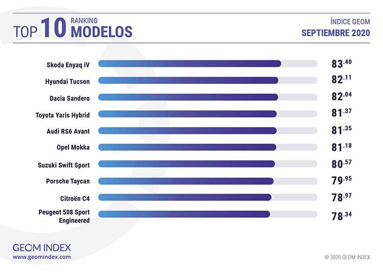 En el apartado de modelos, el nuevo Skoda Enyaq iV, se convirtió en el más valorado del mes con 83.40 puntos y por segunda vez en la historia del ranking GEOM un eléctrico encabezó el ranking mensual. La segunda posición de la lista de modelos fue para uno de los SUV más aclamados de los últimos años, el Hyundai Tucson, con 82.11 puntos, y completó el podio el superventas Dacia Sandero, con 82.04 puntos.
