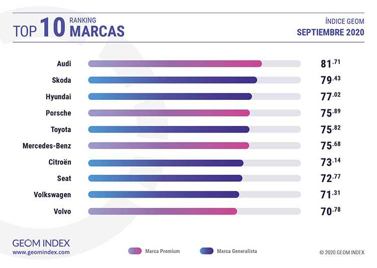 El podio del GEOM Index lo completó Hyundai, segunda además entre las marcas generalistas. La firma de origen coreano alcanzó los 77.02 puntos de valoración en el ranking de la consultora española. En la cuarta plaza y encabezando un grupo de marcas que pelearon por esta posición, se situó Porsche con 75.89 puntos. A solo 5 milésimas se situó Toyota, con 75.82 puntos, mientras Mercedes-Benz logró 75.68 puntos.