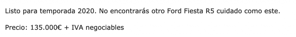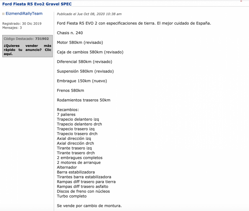 El piloto vasco Gorka Eizmendi ha puesto en venta el Ford Fiesta R5 Evo2 con el que el piloto grancanario Juan Carlos Quintana ha competido esta temporada en el Campeonato de España de Rallys de Tierra (CERT).
