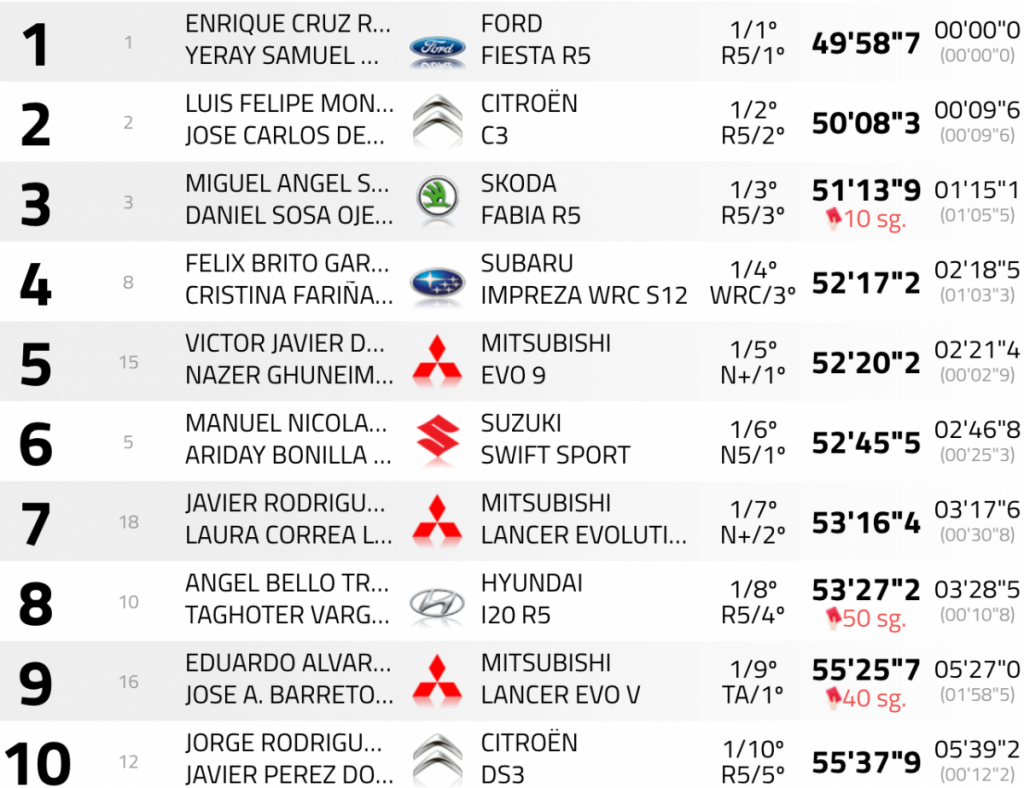 Manolo Mesa y Ariday Bonilla (Suzuki Swift N5 R+) eran sextos, seguidos de Javier Rodríguez – Laura Correa (Mitsubishi Lancer Evo IX), Ángel Bello – Taghoter Vargas (Hyundai i20 R5).