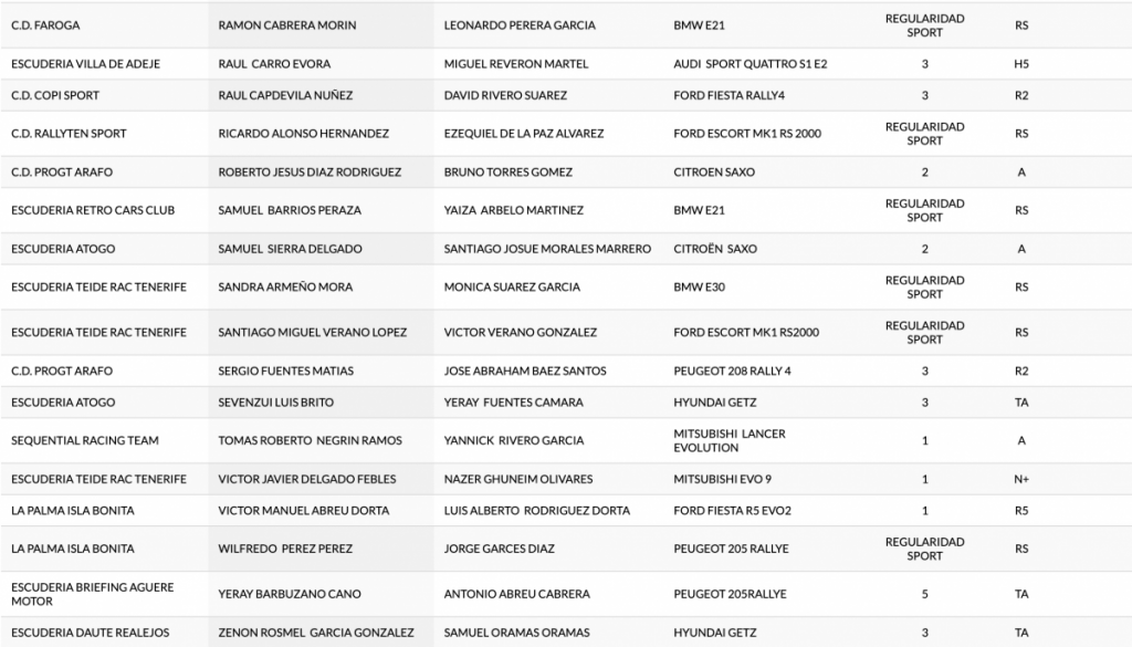 Publicamos la lista provisional del 46º Rallye Orvecame Isla Tenerife, tercera cita del Campeonato de Canarias de Rallys de Asfalto que se disputará los próximos días 30 y 31 de octubre.