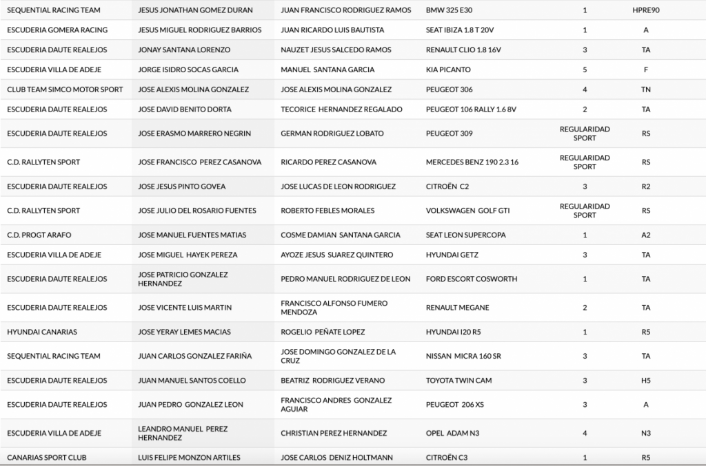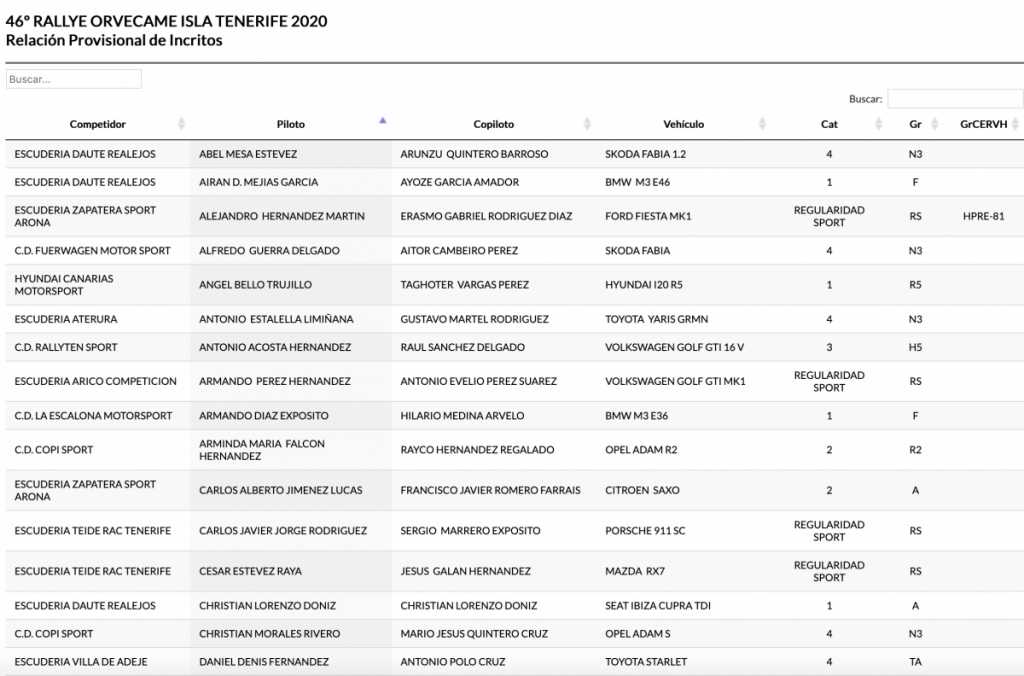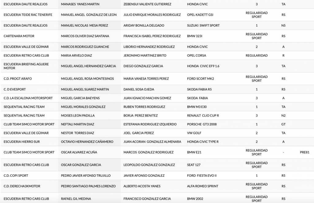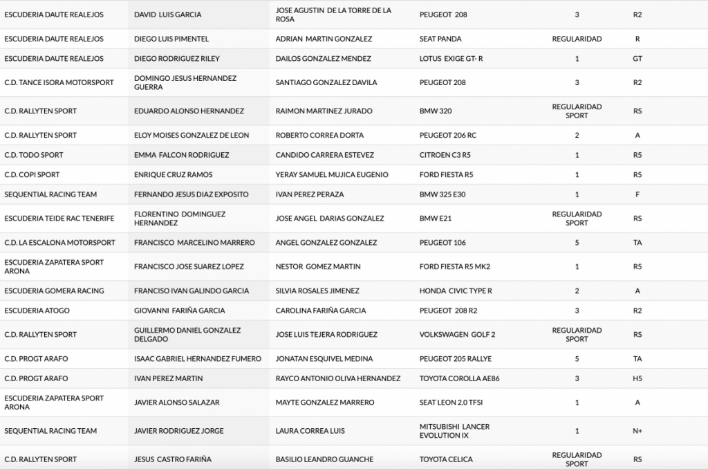 Publicamos la lista provisional del 46º Rallye Orvecame Isla Tenerife, tercera cita del Campeonato de Canarias de Rallys de Asfalto que se disputará los próximos días 30 y 31 de octubre.