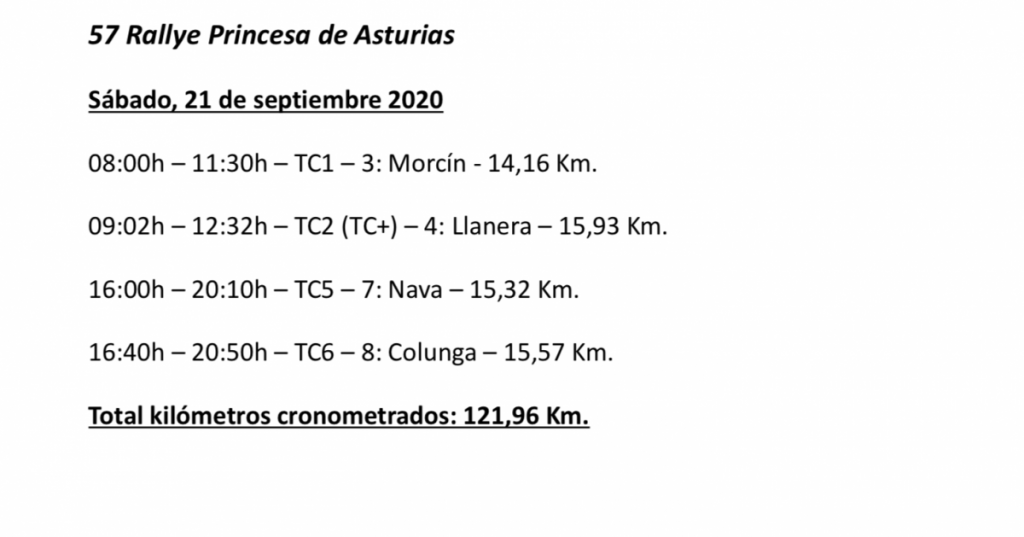 El Rallye Princesa de Asturias, que celebra su edición número cincuenta y siete, contará con cuatro tramos diferentes, con dos pasadas por cada tramo para completar las ocho especiales que suman algo más de ciento veinte kilómetros cronometrados.