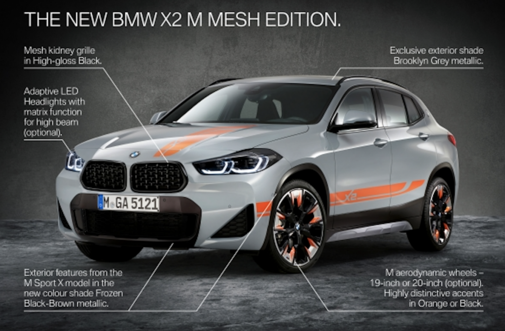 Aún más atractivo y exclusivo, el Sports Activity Coupé (SAC) establece un nuevo nivel con el BMW X2 M Mesh Edition. Con el M Sport X como base de partida, el M Mesh Edition incluye exclusivos y específicos elementos de diseño con el objetivo de atraer a un público joven, atrevido y extrovertido. Su lanzamiento al mercado comenzará en noviembre de 2020. El incremento de precio frente al M Sport X en España será de alrededor de 1.100 euros.