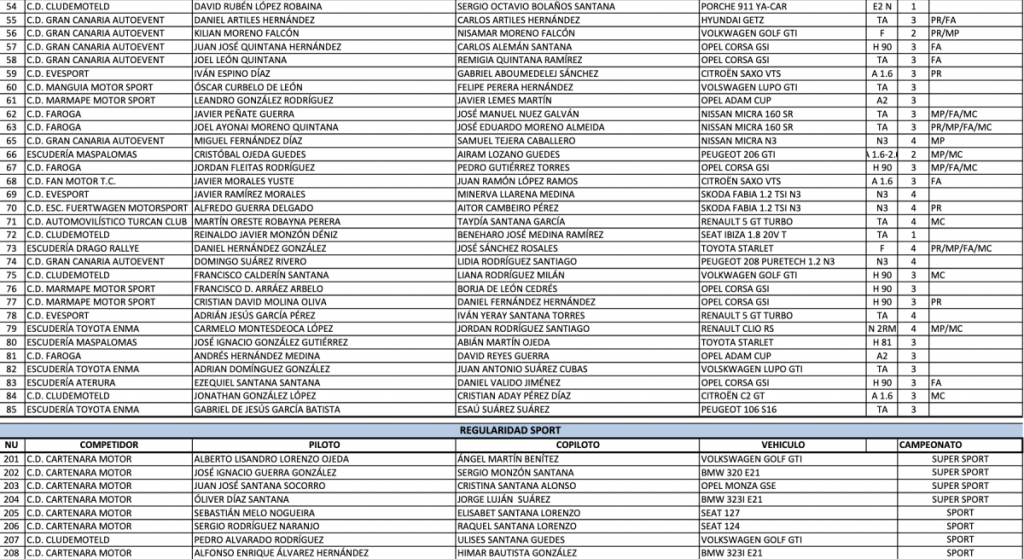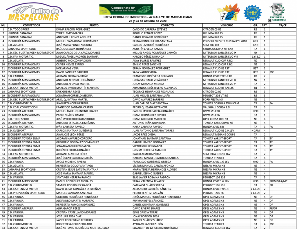 El 47º Rallye de Maspalomas, cita del Campeonato BP de Las Palmas, que ha sido presentado este miércoles en San Fernando de Maspalomas, ha publicado su lista de oficial con los 92 equipos participantes, de los que 84 son de velocidad y ocho en la modalidad de regularidad sport.