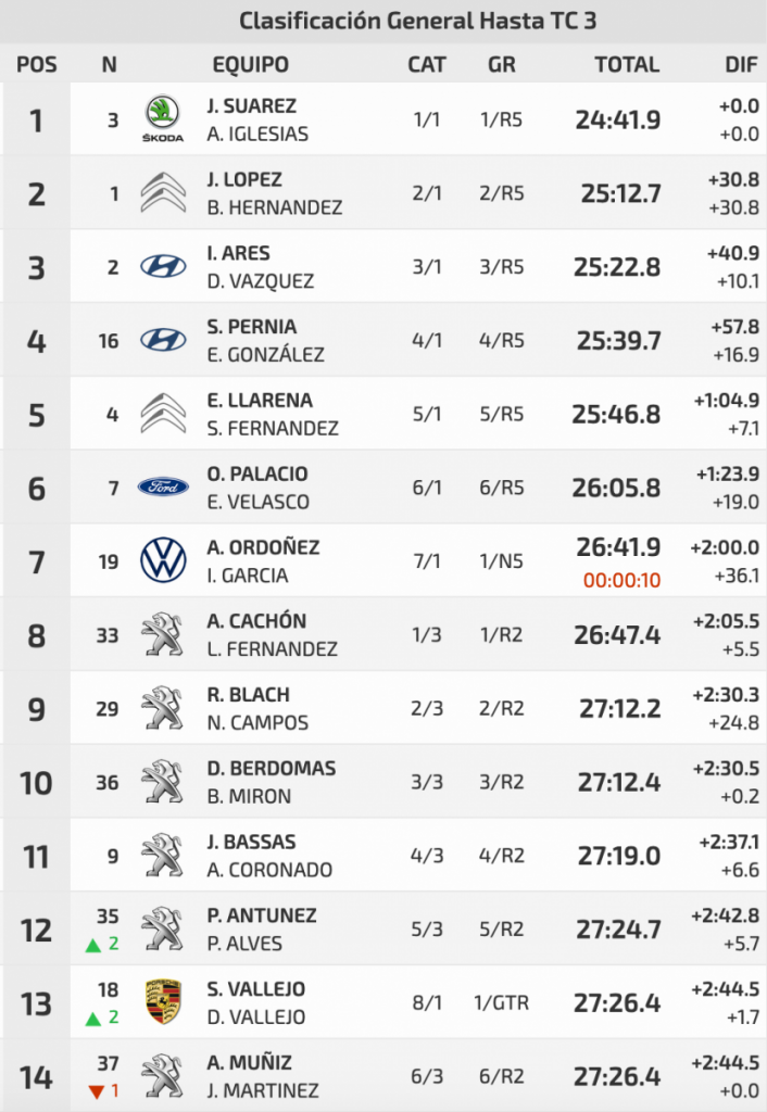 Terceros se sitúan Iván Ares y David Vázquez (Hyundai i20 R5), que como viene siendo habitual, poco pueden hacer ante el mayor empuje de los anteriores, estando a 40.9 de la cabeza y a 10.1 del segundo lugar, pero manteniendo a los cuartos clasificados, Surhayen Pernía y Eduardo González (Hyundai i20 R5), a 16.9.