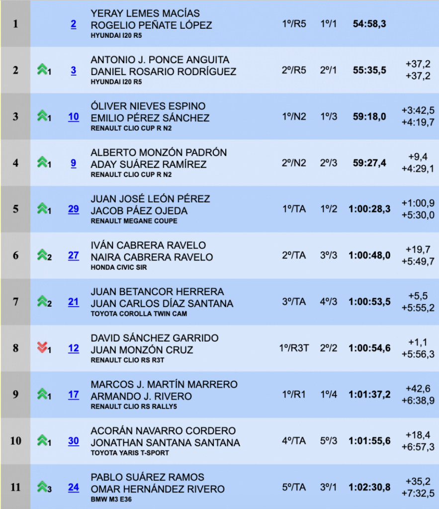 Con tantos abandonos, especialmente en la parte alta, como el de Emma Falcón y Cándido Carrera (Citroën C3 R5) cuando eran cuartos; José María Ponce y Carlos Larrodé (Seat 600 JTR), también cuando eran cuartos, y Noé Armas y Efraín González (Renault Clio R3T) cuando eran quintos, además de otros llamados a estar en las primeras posiciones pero que no pudieron lograrlo antes de abandonar, Raúl Quesada y Tino Vega (Skoda Octavia Kit Car); Anyelo Padrón y Narciso Pérez (Mitsubishi Lancer Evo VIII); Juan Carlos de la Cruz y Miguel Ángel Rodríguez (Mitsubishi Lancer Evo IX), entre otros, propició que un equipo que no ha parado de sorprender a propios y extraños con una conducción eficaz y rápida, el compuesto por Oliver Nieves y Emilio Pérez (Renault Clio Cup R N2), tuviera el justo premio a su empuje con el último escalón del podio.