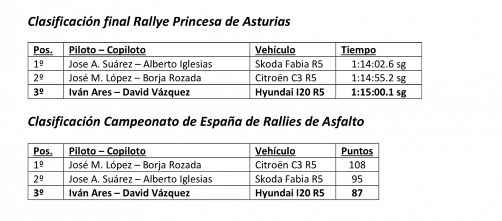 En la cita asturiana, marcada por la ausencia casi total de público durante su recorrido, la dupla Ares-Pintor estuvo peleando por los puestos de honor durante las ocho especiales disputadas, llegando al último tramo con opciones de asaltar la segunda posición, que finalmente se le escapó al equipo gallego por una diferencia mínima. Con este resultado, el equipo subía nuevamente al cajón en el Campeonato de España de Rallies de Asfalto, sumando diecinueve podios en las últimas veintidós pruebas del certamen nacional disputadas, un indicativo de la gran competitividad del conjunto.