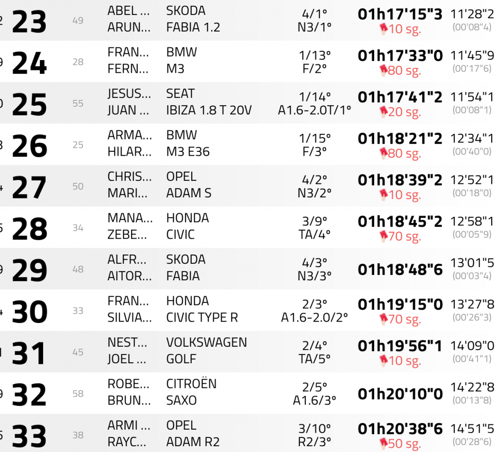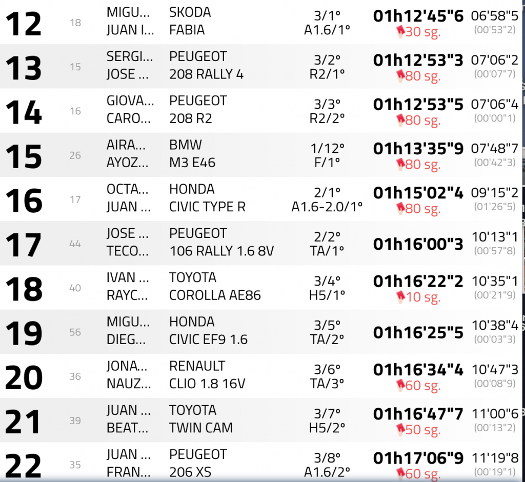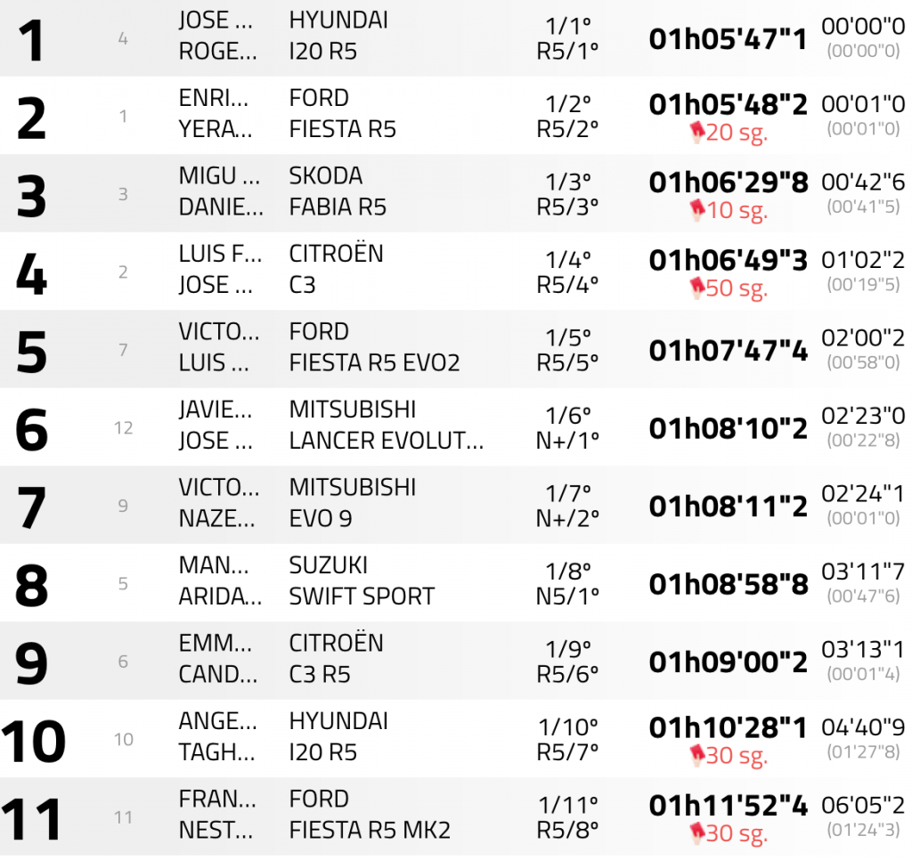 El retraso en tomar la salida en el penúltimo tramo cronometrado del 46 Rally Isla de Tenerife por parte de los líderes Enrique Cruz y Yeray Mujica (Ford Fiesta R5) ha supuesto que recibieran una penalización de 20 segundos y que de esta manera perdieran un triunfo que se habían ganado desde el primer metro, pero que tras la decisión de los comisarios deportivos perdían por tan solo un segundo en favor de Yeray Lemes y Rogelio Peñate (Hyundai i20 R5).