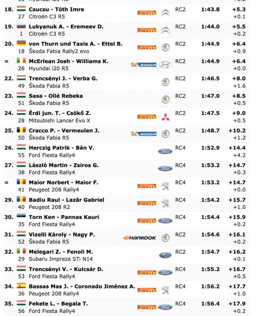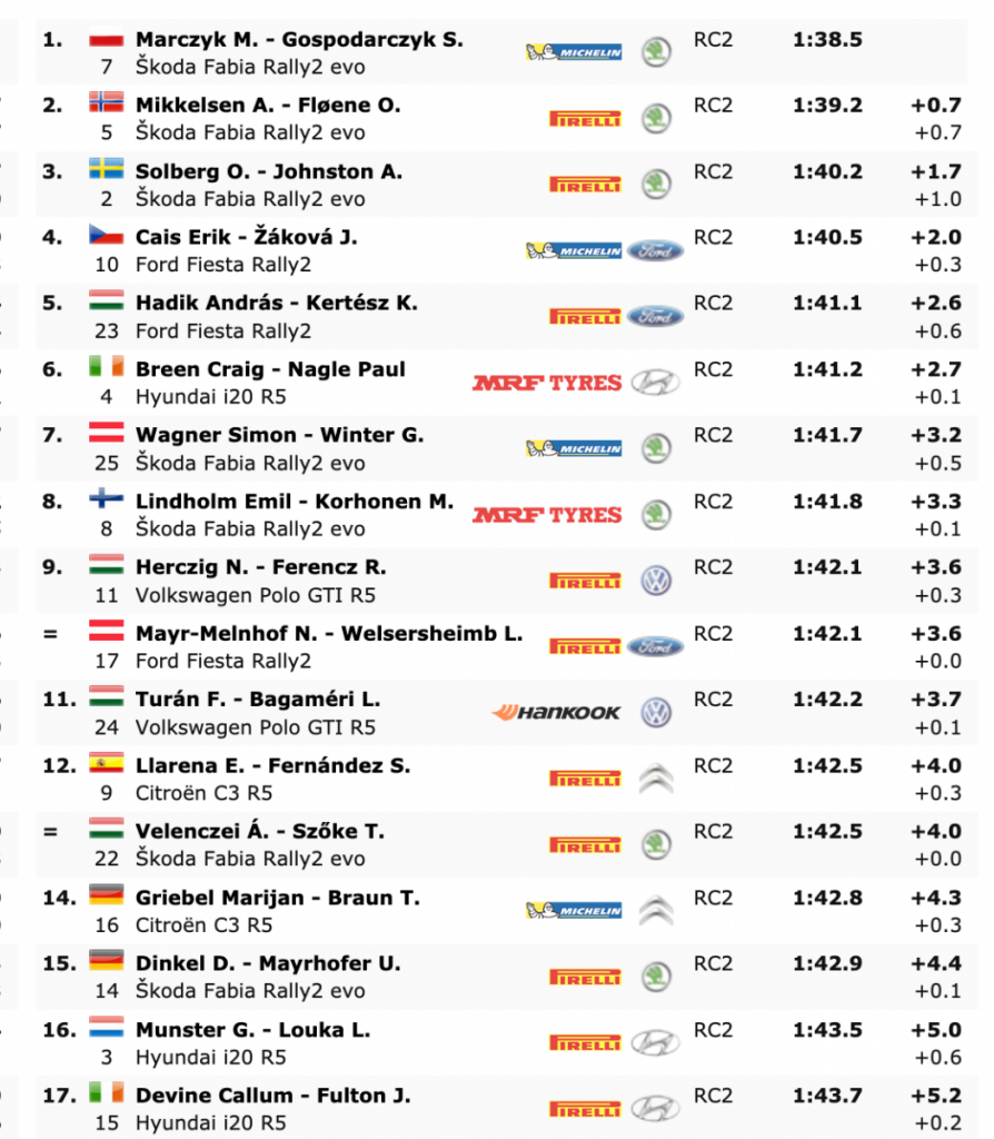 El líder del campeonato, Alexey Lukyanuk, perdió 5.5 segundos después de detenerse en la salida con su Citroën C3 R5 del Saintéloc Junior Team calzado Pirelli. El cuatro veces campeón nacional Norbert Herczig fue 12º para el MOL Racing Team, justo detrás de Niki Mayr-Melnhof.