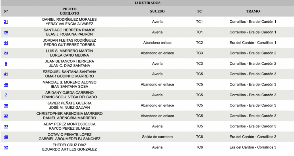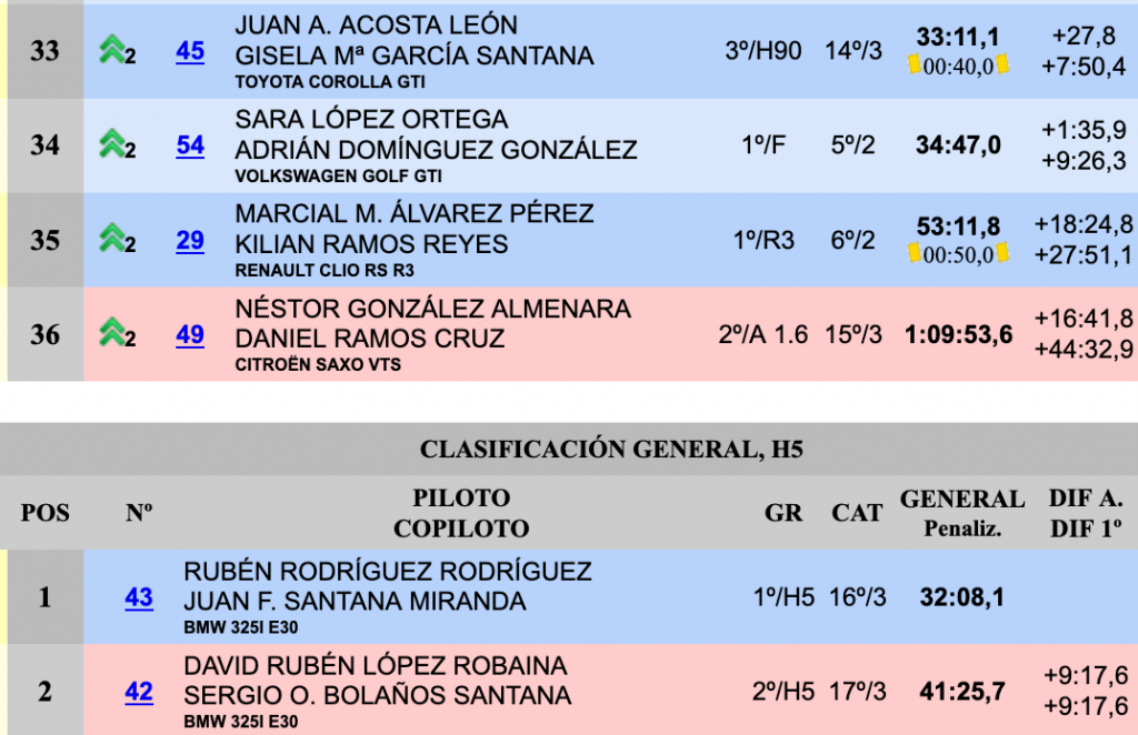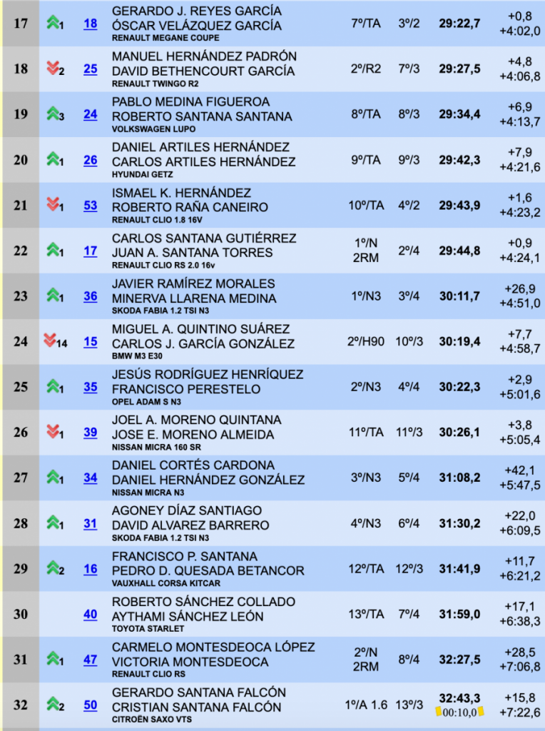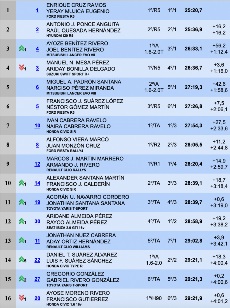 Gran clasificación para Iván y Naira Cabrera, imposible mejorar con el Honda Civic, séptimos de la general, por delante del Alfonso Viera-Juan Monzón con el Ford Fiesta R4 de Copi Sport, apurando kilómetros también de cara al Islas Canarias en su debut con este vehículo con mucho futuro. Como es el caso de Marcos Martín-Armando Rivero, que fueron novenos con un Renault Clio Rally5 del que siguen aumentando buenas sensaciones. Alexander Santana-Francisco Calderín cerraban con el Honda Civic el grupo de los diez primeros de la general, con unos 37 clasificados del total de 51 equipos que tomaron la salida en velocidad.