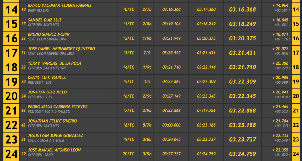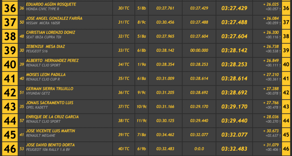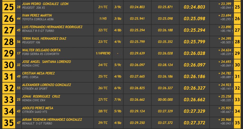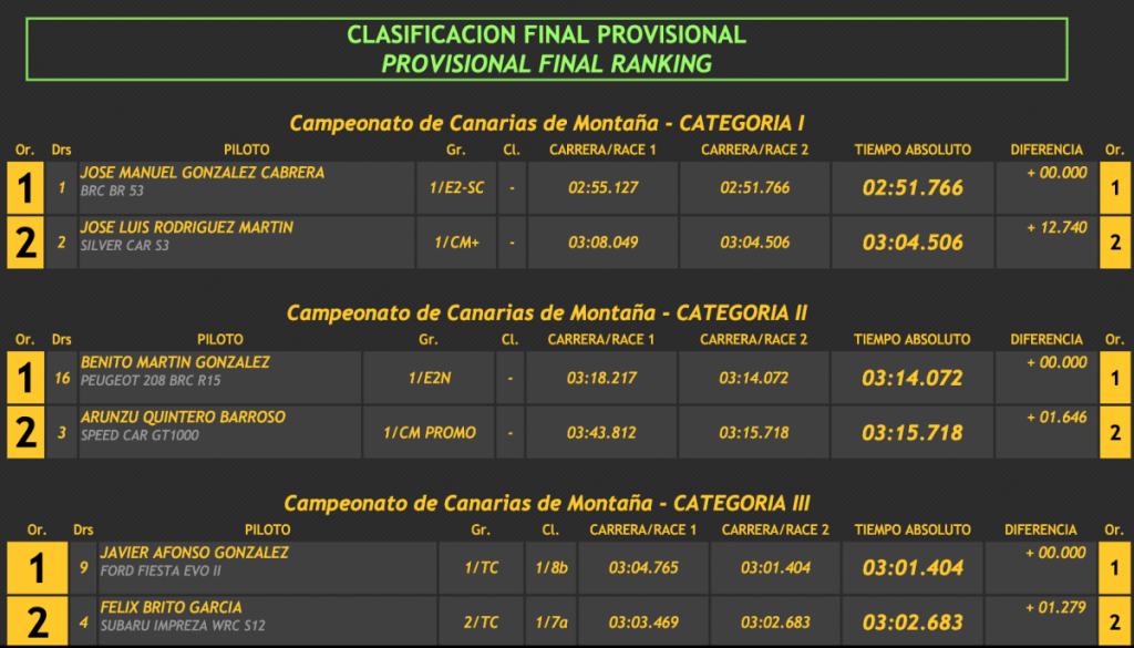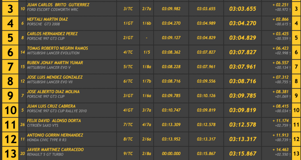 El menor de los Afonso se anotó un 3:04.765 para finalizar con un 3:01.404, logrando demostrar que también sabe ganar en turismos al superar en 1.279 al veterano Félix Brito (Subaru Impreza WRC) y a su hijo Juan Carlos Brito (Ford Escort Cosworth WRC), tercero, que se quedó a 2.251 de la cabeza, a 0.972 de su padre y logrando superar en 0.615 a Neftalí Martín (Porsche 997 GT3 2008), cuarto.