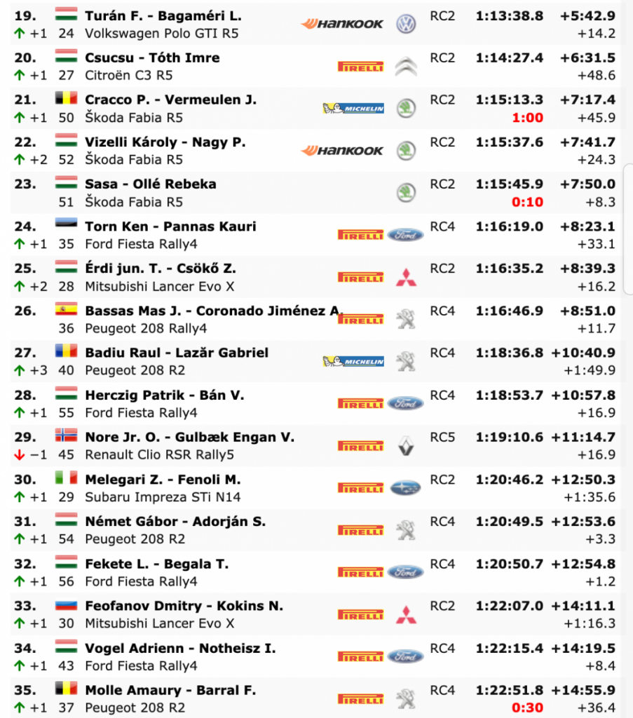 El líder del campeonato europeo, Lukyanuk, estaba 5,1 segundos por detrás de Mikkelsen en la parada de servicio del mediodía en Nyíregyháza, pero no estaba contento con la finalización del TC6, informando que había entrado en el control de salida de etapa cinco minutos antes. La penalización de cinco minutos que siguió ha dejado al ruso fuera de la contienda en la medida en que es poco probable que anote puntos ERC por primera vez esta temporada con su Citroën C3 R5 del Saintéloc Junior Team.