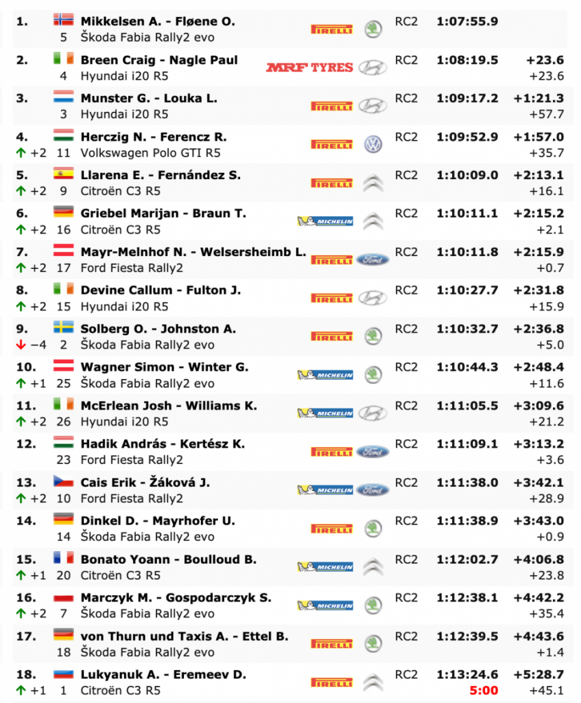 Craig Breen es segundo, estando 23,6 segundos por detrás de Mikkelsen después de un trompo esta mañana. Sin embargo, el irlandés subrayó el progreso de sus neumáticos MRF al conseguir un par de victorias de etapa con su Hyundai i20 R5. “Conseguir un podio para MRF Tires y el equipo es muy importante, porque han estado trabajando muy duro. Es bastante increíble obtener victorias de etapa después de un corto período de tiempo».