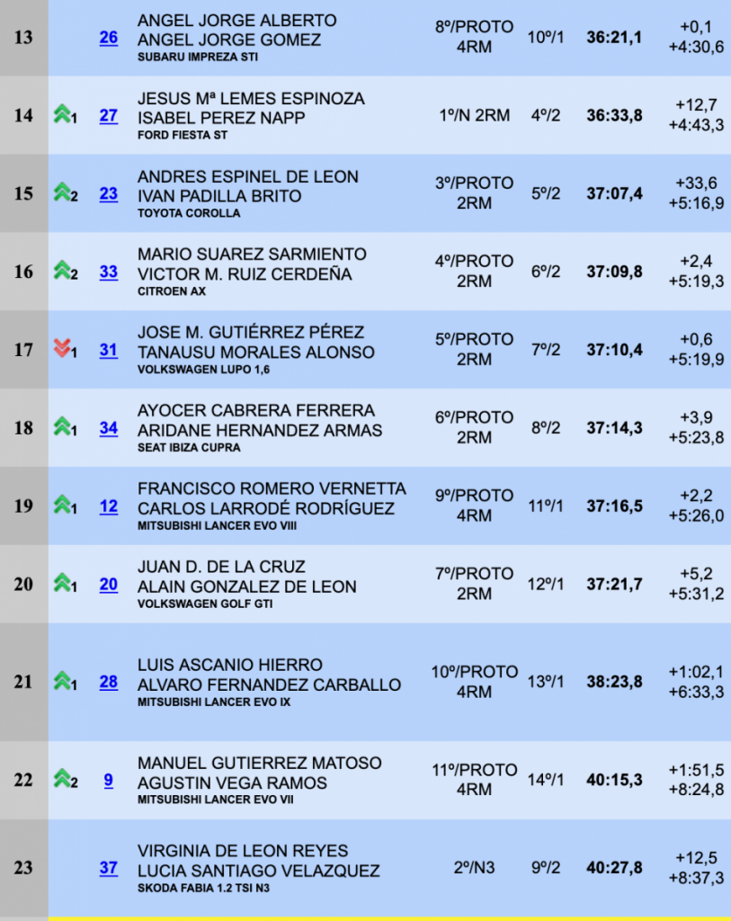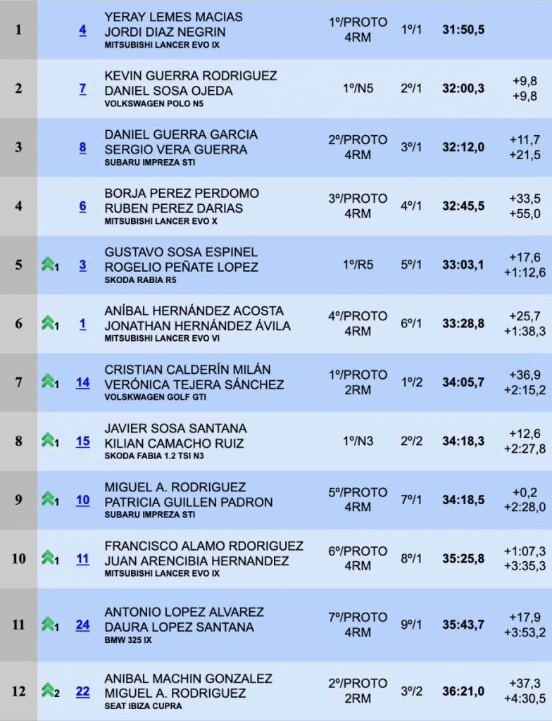 Terceros, a 11.7 del segundo puesto y a 21.5 de la cabeza finalizaron Daniel Guerra y Sergio Vera (Subaru Impreza STI), que dejaron por detrás a Borja Pérez y Rubén Pérez, que después de ir segundos fueron perdiendo fuelle.