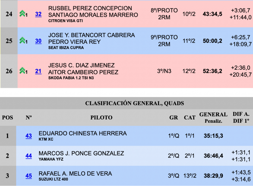 Pero a partir de ahí cambiaron para mal las cosas para Guerra y Sosa, puesto que en la quinta especial marcaron el décimo cuarto crono, a 34,2 de Lemes y Díaz, que fueron los más rápidos, pasando entonces a liderar la prueba los del Evo IX, que a partir de ese momento pusieron la directa para ganar las siguientes dos especiales y terminando el día con una renta a su favor de 9,8 sobre los del Polo N5, que finalmente se tuvieron que conformar con el segundo lugar después de haber soñado con la victoria, la que tuvieron cerca.