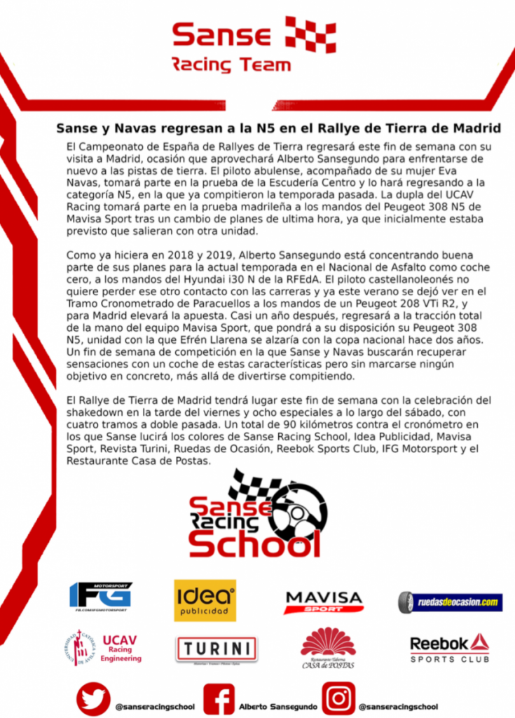 El piloto Alberto Sansegundo participará este fin de semana en el Rallye de Tierra de Madrid con un Peugeot 308 N5.