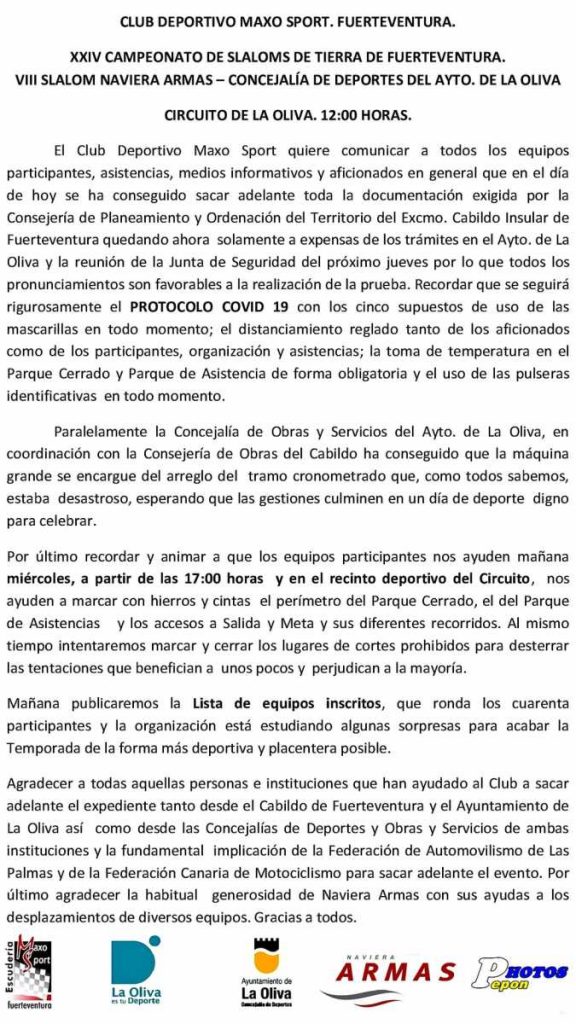 El Slalom Naviera Armas logra la documentación necesaria para poder celebrarse Por Rafa León Última actualización: 18/11/2020 19:44 Compartir FacebookTwitterWhatsAppEmailTelegramLinkedin La Escudería Maxo Sport ha informado que el Slalom Naviera Armas saldrá adelante puesto que la organización ha logrado reunir toda la documentación necesaria para poder celebrar la prueba. Campeonato de FuerteventuraCanariasEspañaEuropaFuerteventuraLas PalmasSlalom Naviera Armas Compartir