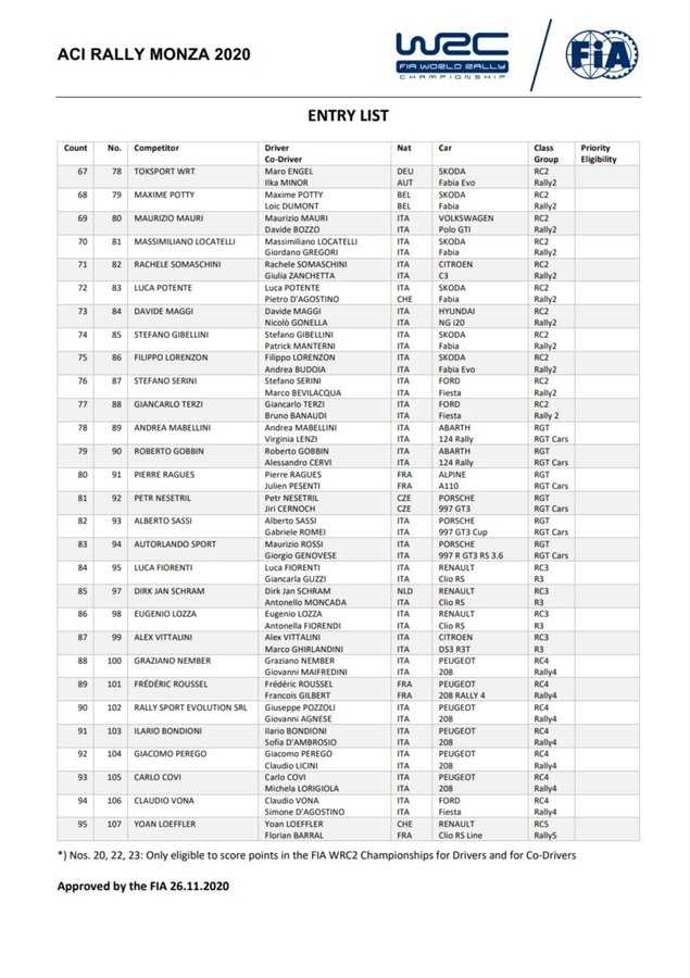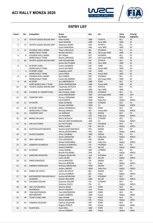 Se ha publicado la lista de inscritos del Aci Rally de Monza (Italia), cita del Campeonato del Mundo de Rallys donde estarán los cántabros Dani Sordo y Carlos del Barrio en el Hyundai i20 WRC oficial, siendo la gran novedad el regreso al Mundial del grancanario o Rogelio Peñate, que copilotará a Fabrizio Zaldivar.
