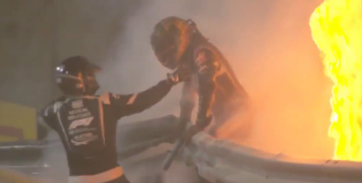El piloto francés de Haas Romain Grosjean sufrió un espectacular accidente en la primera vuelta del GP de Bahréin de F1, en el que su coche se estrelló contra las vallas y se incendió. Afortunadamente, el galo salió vivo, con algunas zonas en las manos y tobillos quemadas y, quizás, también una costilla rota.
