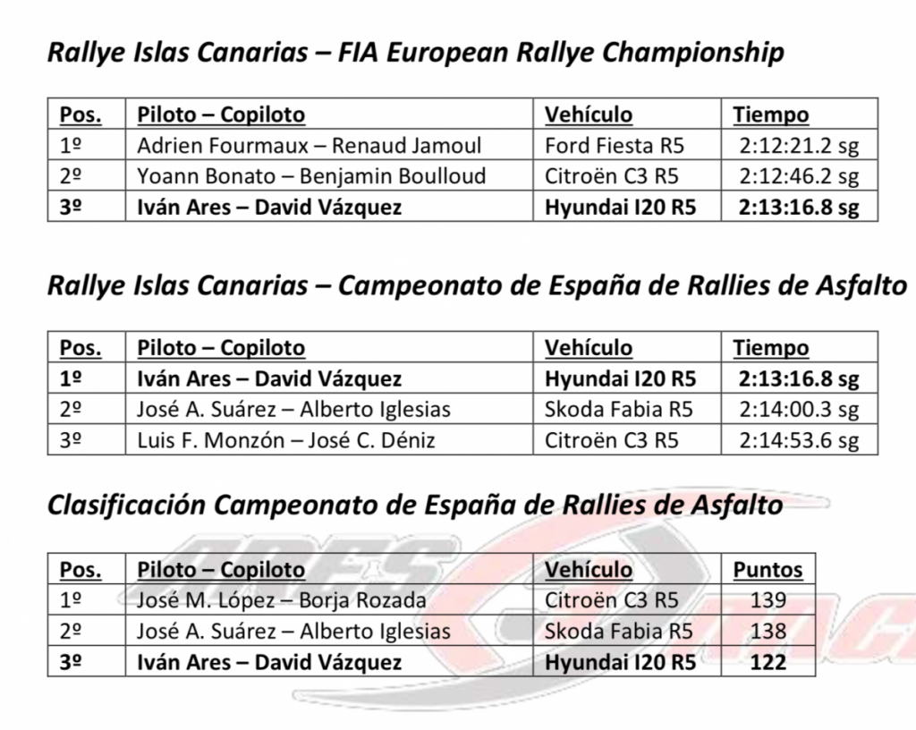 Fin de semana para la historia del automovilismo continental, en un Rallye Islas Canarias en el que la climatología puso contra las cuerdas a todos los equipos participantes, y en el que el piloto de Cambre afincado en Carral, Iván Ares, y su navegante, el estradense, David Vázquez, volvieron a demostrar que pueden pelear de tú a tú y doblegar a los mejores equipos del FIA European Rallye Championship. Además, la dupla gallega se impuso dentro del certamen nacional, sumando una victoria que deja un balance positivo para cerrar la temporada puntuable.