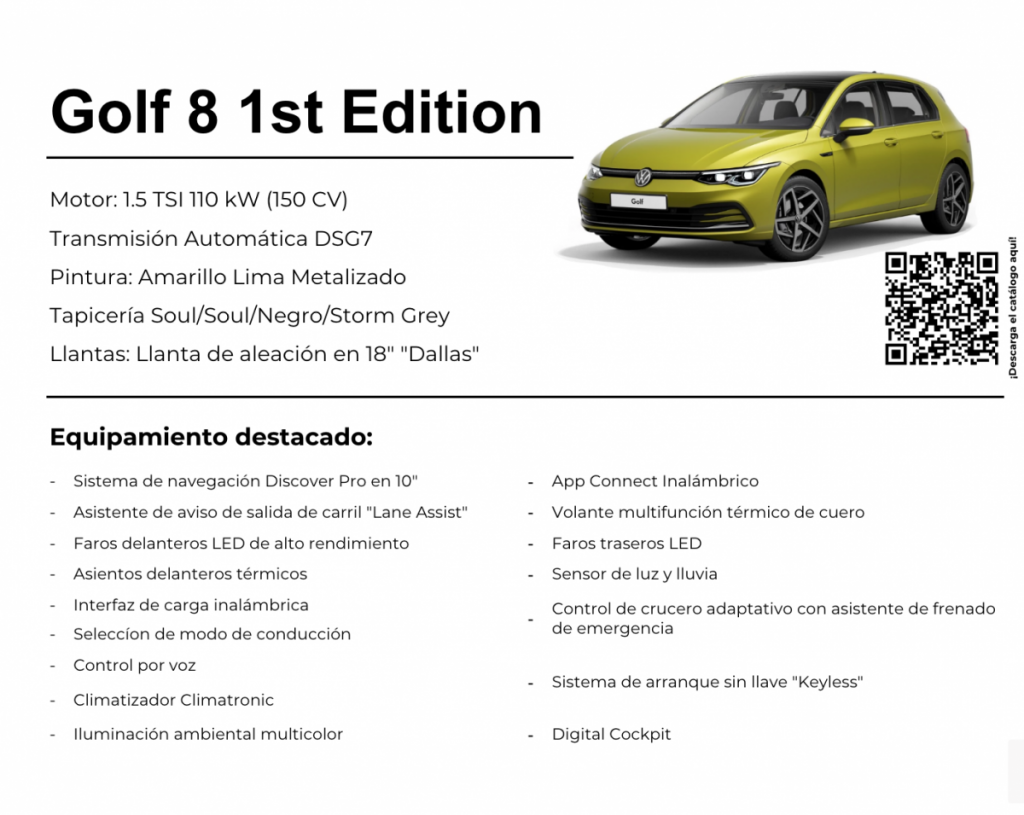 Más deportivo, más dinámico y digital como nunca, el nuevo Volkswagen Golf 8 sigue siendo el rey de los compactos. Los clientes podrán disfrutar como nunca se podían imaginar de la digitalización en la carretera con trayectos más cómodos con los sistemas de asistencia inteligente. El nuevo Golf está preparado para todo lo que tu vida te depare hoy. Y mañana.