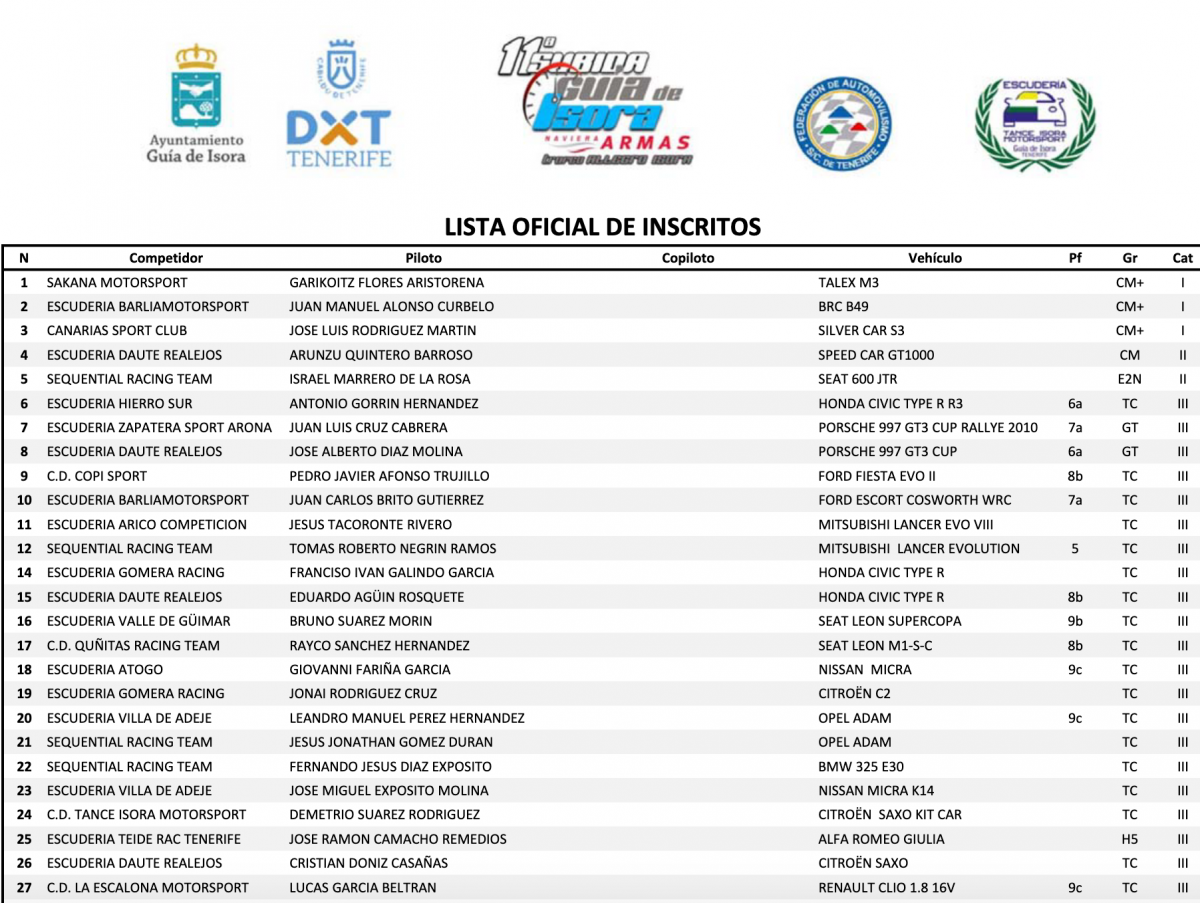 Tal y como marca el programa horario, a las 20:00 horas de hoy martes se ha hecho pública la Lista Oficial de Inscritos de la 11º Subida Guía de Isora Naviera Armas ‘Trofeo Allegro Isora’, en la que figuran los 51 equipos que finalmente tomarán la partida este próximo sábado en la rampa isorana.