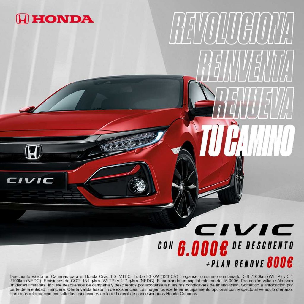 Revoluciona, Reinventa, Renueva tu Camino, ofrece a los clientes de la marca la oportunidad única de hacerse con el Honda Civic que siempre han deseado a un precio irresistible. Con esta nueva iniciativa, la marca nipona continúa con su firme apuesta por la satisfacción de las necesidades de todos sus clientes con el objetivo de seguir invadiendo las calles del archipiélago canario. Además los clientes interesados podrán beneficiarse del Plan Renove, un paquete de ayudas promovido por Gobierno con el que conseguir hasta 800€ de descuento.
