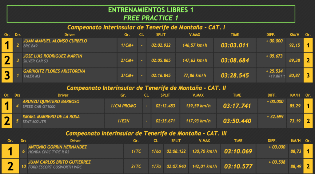 Si en la primera manga de entrenamientos libres Tony Gorrín y su Honda Civic Type R R3 fueron los más rápidos, en los entrenamientos oficiales era Juan Carlos Brito (Ford Escort WRC) el que marcaba el mejor crono, a 142,50 km/h, parando el reloj en 3:01.753, seguidos de Juan Luis Cruz (Porsche 997 GT3 Cup Rallye 2010) a 3.736, José Alberto Díaz (Porsche 997 GT3 Cup) a 3.770 de la cabeza y a sólo 0.034 de Cruz.