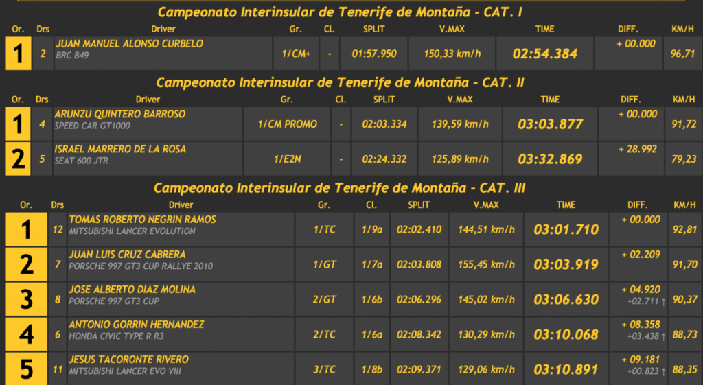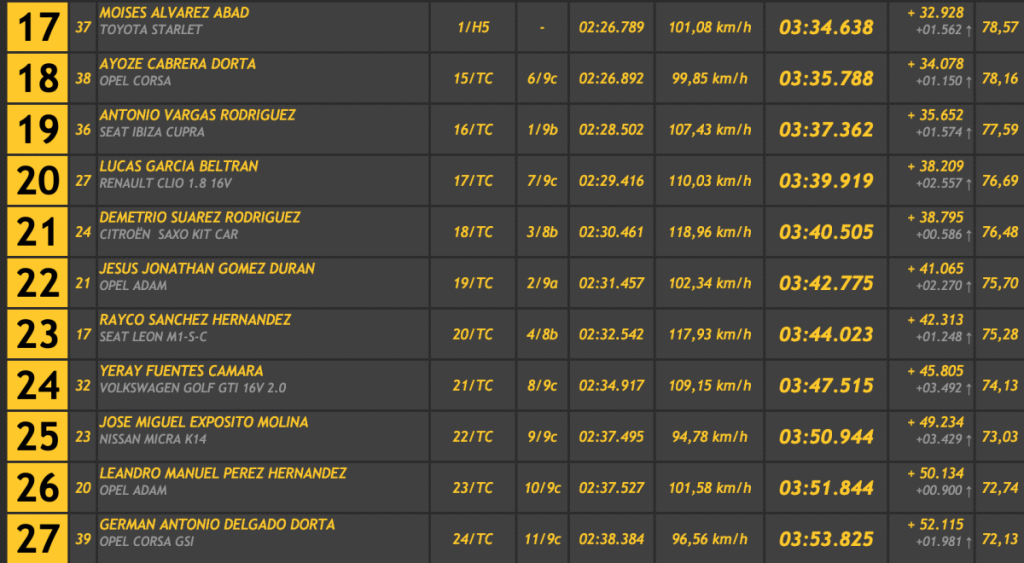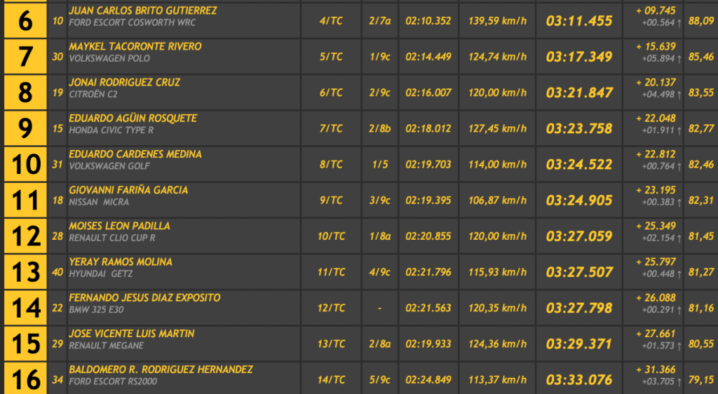 Su tiempo le ha valido para superar en 2.209 a Juan Luis Cruz (Porsche 997 GT3 Cup Rallye 2010), en 4.920 a José Alberto Díaz (Porsche 997 GT3 Cup), en 8.358 a Tony Gorrín (Honda Civic Type R R3), en 9.181 a Jesús Tacoronte (Mitsubishi Lancer Evo VIII) y en 9.745 a Juan Carlos Brito (Ford Escort WRC), que después de anotarse un mejor tiempo de 3:01.753, perdía mucho en la primera oficial. que si logra repetirla en la ascensión final le puede dar un puesto, como mínimo, de podio.