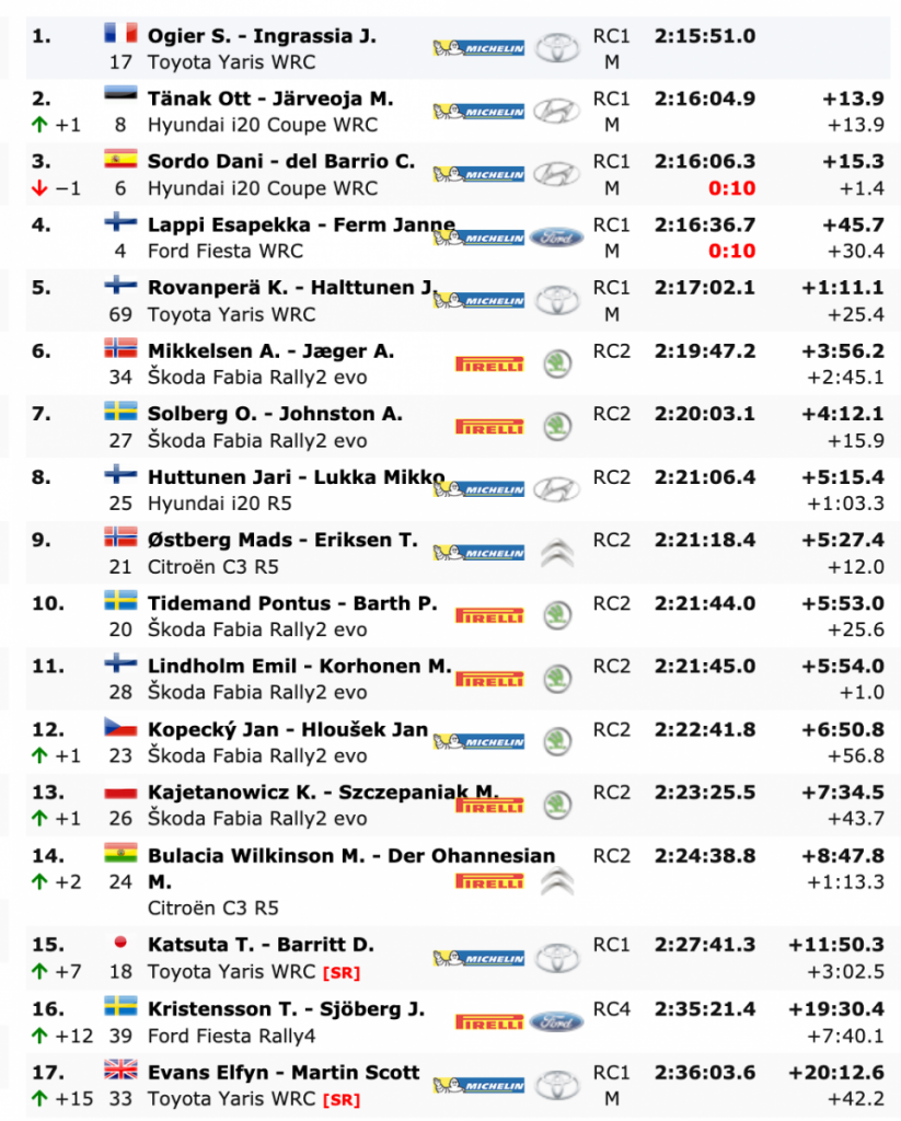 Donde si hubo movimiento fue en la lucha por la segunda posición, en la que partían los españoles Dani Sordo y Carlos del Barrio (Hyundai i20 WRC), pero no pudieron con el mayor empuje de sus compañeros de equipo, Ott Tänak y Martin Järveoja (Hyundai i20 Coupe WRC), que fueron más rápidos que ellos y por sólo 1.4 se alzaban con el segundo puesto.