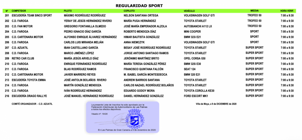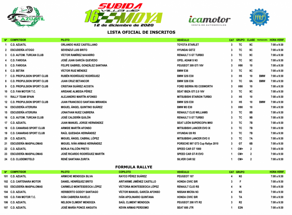 En el transcurso del acto se ha dado a conocer la lista oficial de inscritos, cuyo número total asciende a 46 participantes entre Velocidad, Fórmula Rallye y RS. La novedad más importante es el debut del piloto Raúl Quesada con el Hyundai i20 R5 habitual de Toñi Ponce.
