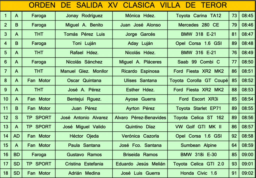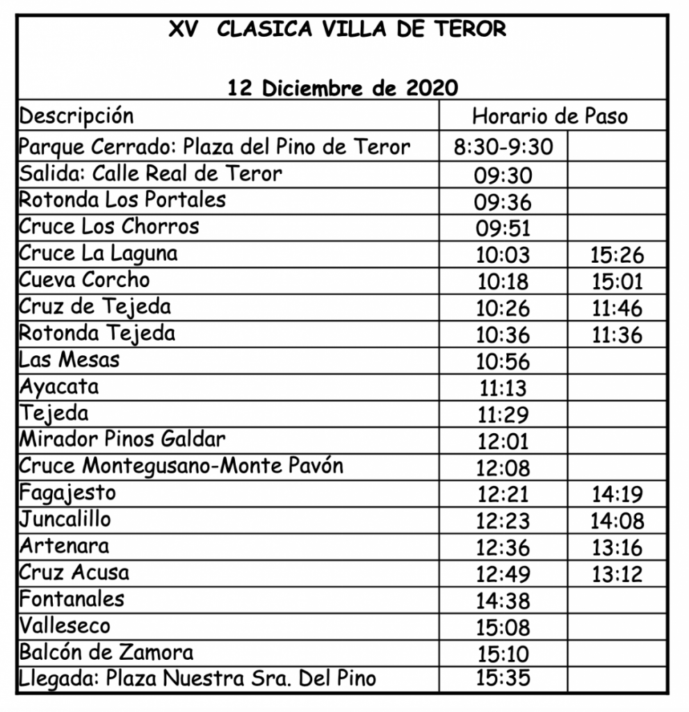 Publicamos el orden de salida y horarios de paso de la Clásica Villa de Teror, evento que se celebrará en la isla de Gran Canaria este sábado, 12 de diciembre.