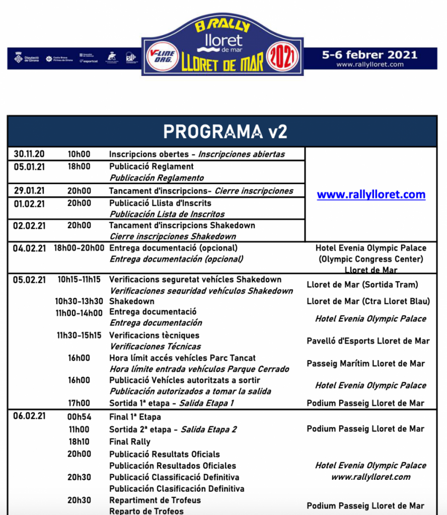 En cuanto al programa-horario, la mañana del día 5 de febrero se realizarán las verificaciones administrativas (Hotel Evenia Olympic Palace) y técnicas (Pabellón Deportivo) y también el shakedown o tramo de pruebas (carretera Lloret Blau).