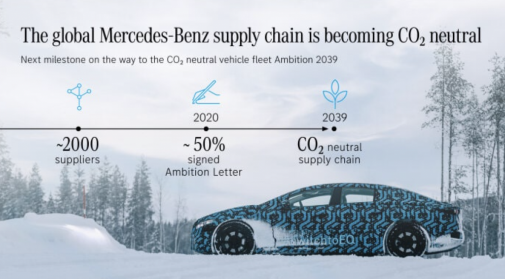 · Como parte del objetivo Ambition 2039, Mercedes-Benz está impulsando la transformación hacia unas emisiones neutras de CO2 con un conjunto de medidas a lo largo de toda la cadena de valor. La red de proveedores es un elemento clave para alcanzar los objetivos climáticos de Mercedes-Benz debido a la mayor demanda de energía en la producción de vehículos completamente eléctricos.