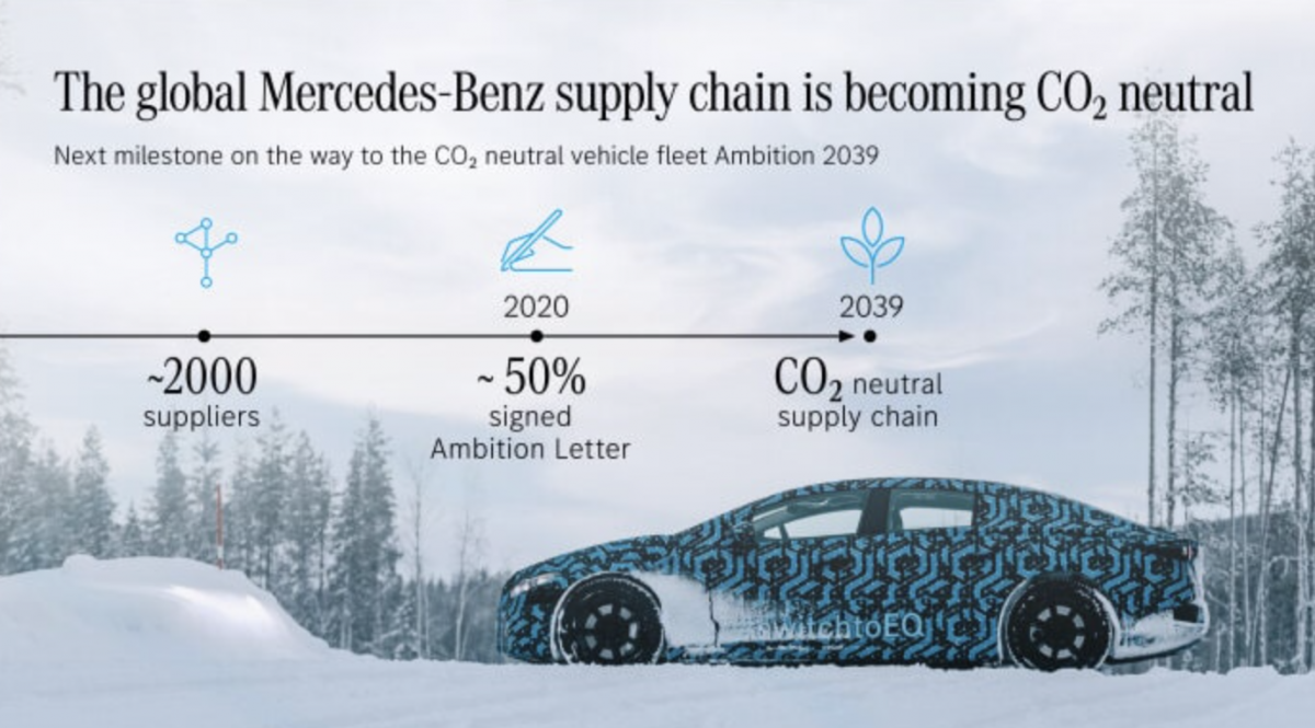 · Como parte del objetivo Ambition 2039, Mercedes-Benz está impulsando la transformación hacia unas emisiones neutras de CO2 con un conjunto de medidas a lo largo de toda la cadena de valor. La red de proveedores es un elemento clave para alcanzar los objetivos climáticos de Mercedes-Benz debido a la mayor demanda de energía en la producción de vehículos completamente eléctricos.