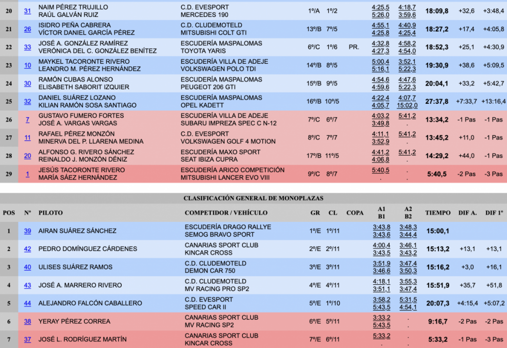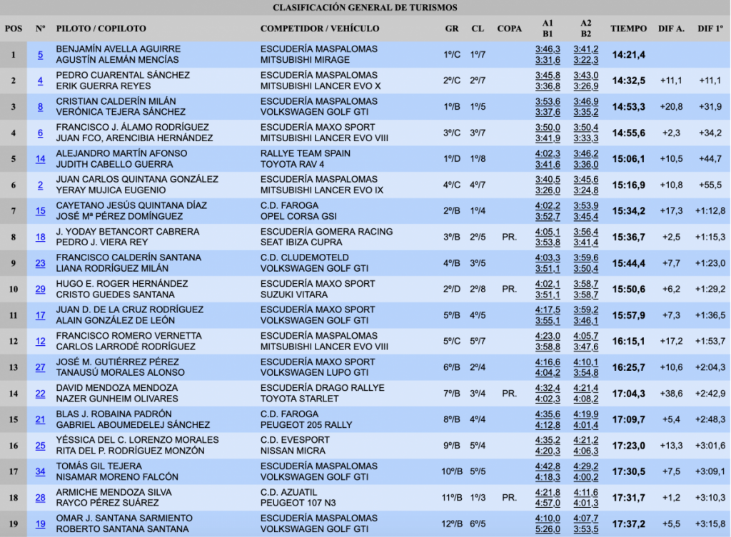 Segundos fueron Pedro Cuarental y Erik Guerra (Mitsubishi Lancer Evo X), seguidos de Cristian Calderín y Verónica Tejera (Volkswagen Golf GTI), que veían premiada su constante entrega con el último escalón del podio.