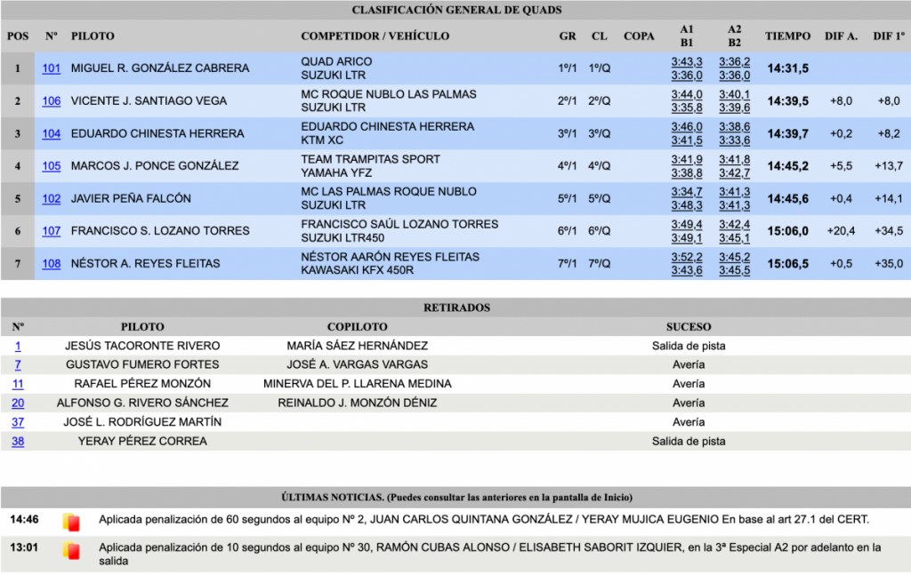 Quintana y Mujica mandaban en esa especial, a pesar de algún problema de falta de conocimiento de la montura cedida por Yeray Lemes, y aunque pincharon en la tercera especial, nadie podía con ellos, logrando finalizar como vencedores. Segundos quedaban Benjamín Avella y Agustín Alemán, pero una vez finalizada la prueba reclamaban asistencia ilegal de los vencedores, que recibieron ayuda externa para solventar el pinchazo de su Evo, por lo que fueron sancionados con un minuto de penalización, por lo que del primer puesto descendieron al sexto.
