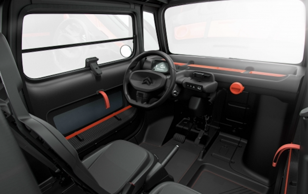 En pro del espacio y de la facilidad de movimientos, los dos asientos simétricos están ubicados de forma escalonada, el de la persona que conduce situado sobre guías (regulable longitudinalmente) y el del pasajero fijo.
