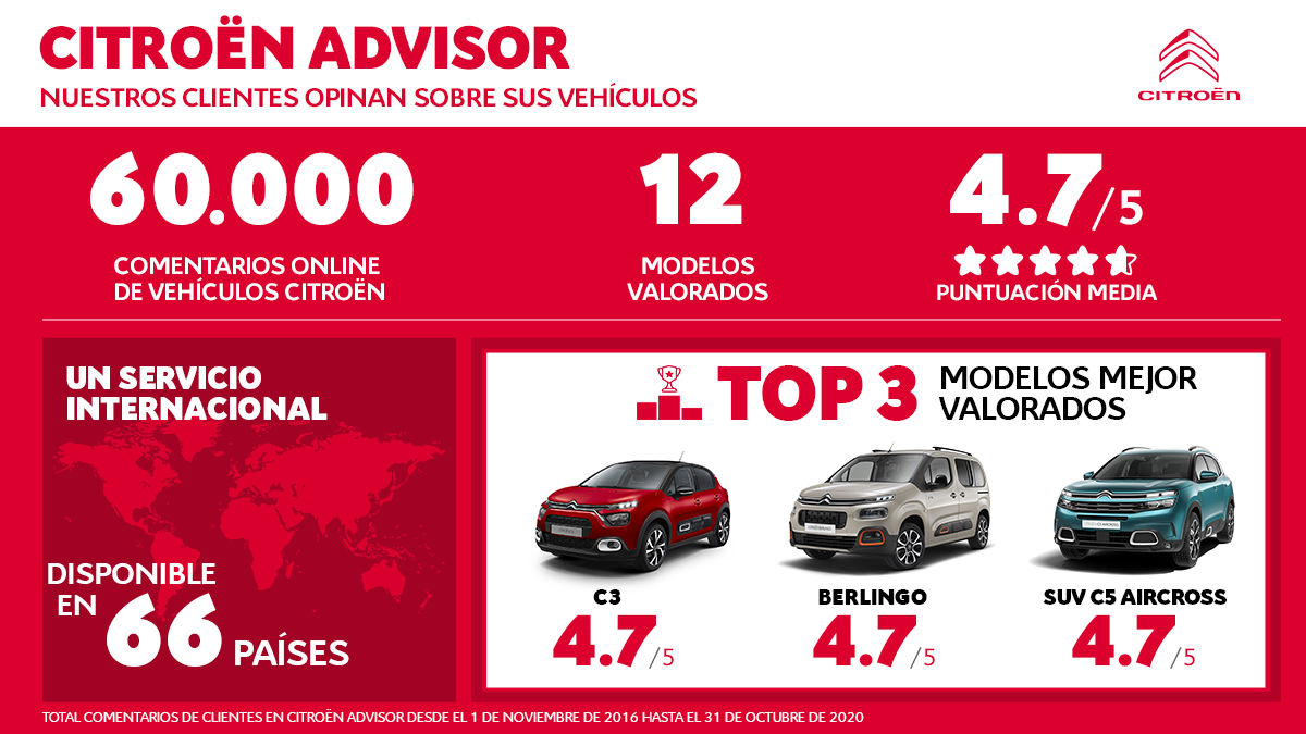 Citroën también somete sus vehículos al juicio de sus clientes en la web. Con Citroën Advisor Productos, cualquier persona puede evaluar y compartir su opinión sobre su Citroën nuevo, después de la entrega. El conjunto de la gama obtiene un sobresaliente por parte de las personas que disfrutan de los vehículos de la marca, concretamente un 4,7 sobre 5 como media. Las personas que los conducen o que viajan a bordo valoran su confort, facilidad de conducción, estabilidad y acabados interiores.