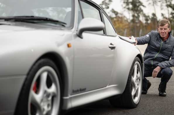 «El siguiente gran paso adelante: tracción a las cuatro ruedas. Creo que, de alguna manera, jugué un papel nada despreciable en esto después de decir que un coche sin tracción a las cuatro ruedas es una solución provisional. Al principio, durante el desarrollo, dije que no era posible hacer un coche con 408 CV sin tracción a las cuatro ruedas. Después de muchas pruebas, nos decidimos por el nuevo embrague viscoso con distribución de potencia variable hacia adelante, en lugar del viejo principio con distribución fija. Especialmente en combinación con el nuevo eje trasero Weissach y la progresiva entrega de potencia del motor biturbo, el 993 Turbo es simplemente fantástico de conducir y difícilmente puede ser superado cuando se trata de dinámica de conducción».