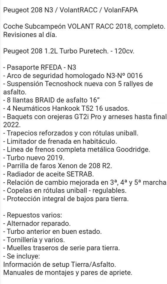 El Peugeot 208 1.2 Pure Tech N3 con el que los grancanarios Pablo Suárez e Israel Pereira compitieron en el Campeonato de Cataluña de Rallys en el Volant RACC en las últimas temporadas, mientras que en Gran Canaria Domingo Suárez, padre de Pablo, lo condujo esta temporada 2020 en el Rally Comarca Norte de Gran Canaria, Maspalomas e Islas Canarias, ha sido puesto a la venta.