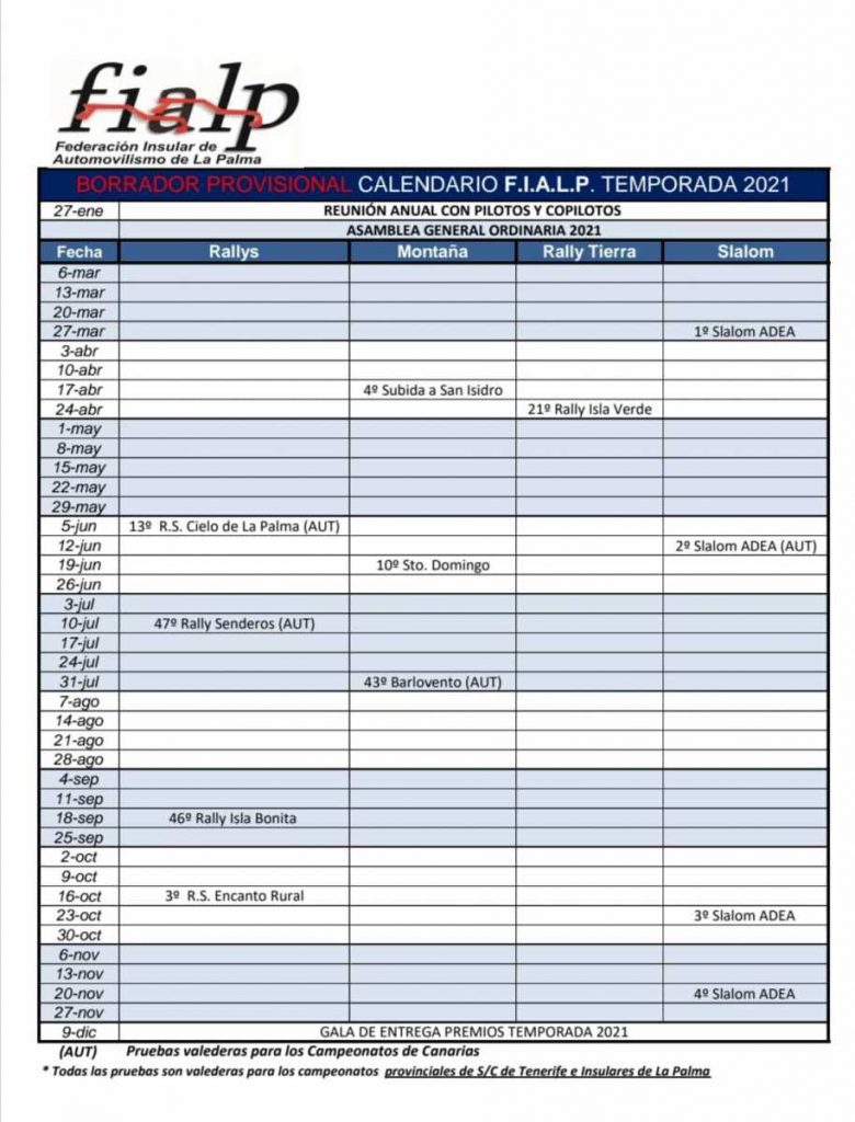 Por ese motivo, la Federación Insular de Automovilismo de La Palma (FIALP) ha presentado un boceto de cara a la temporada 2021, donde, si todo sale según lo previsto, el 27 de marzo, con motivo del I Slalom Adea 2021, se volverá a escuchar rugir los motores de competición en la isla.