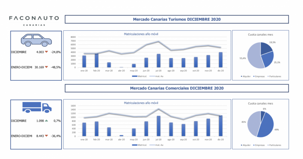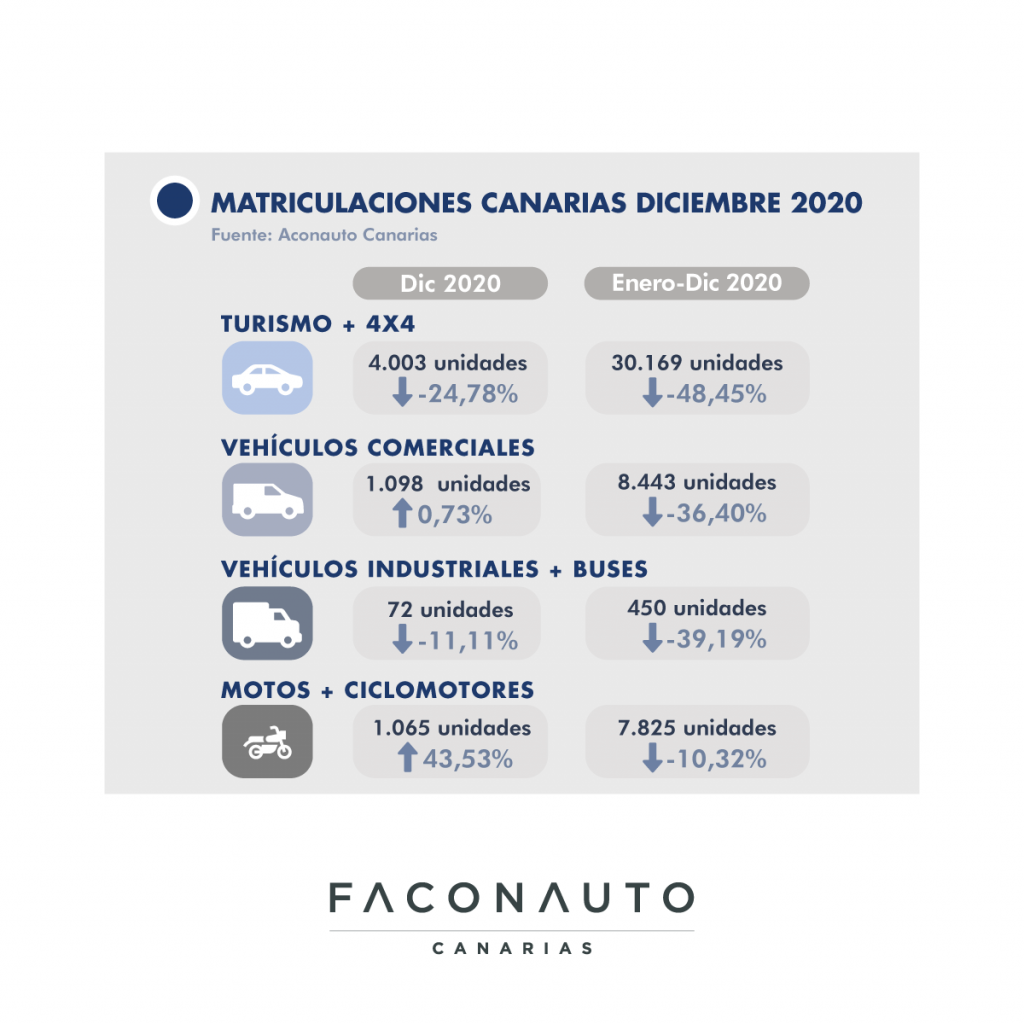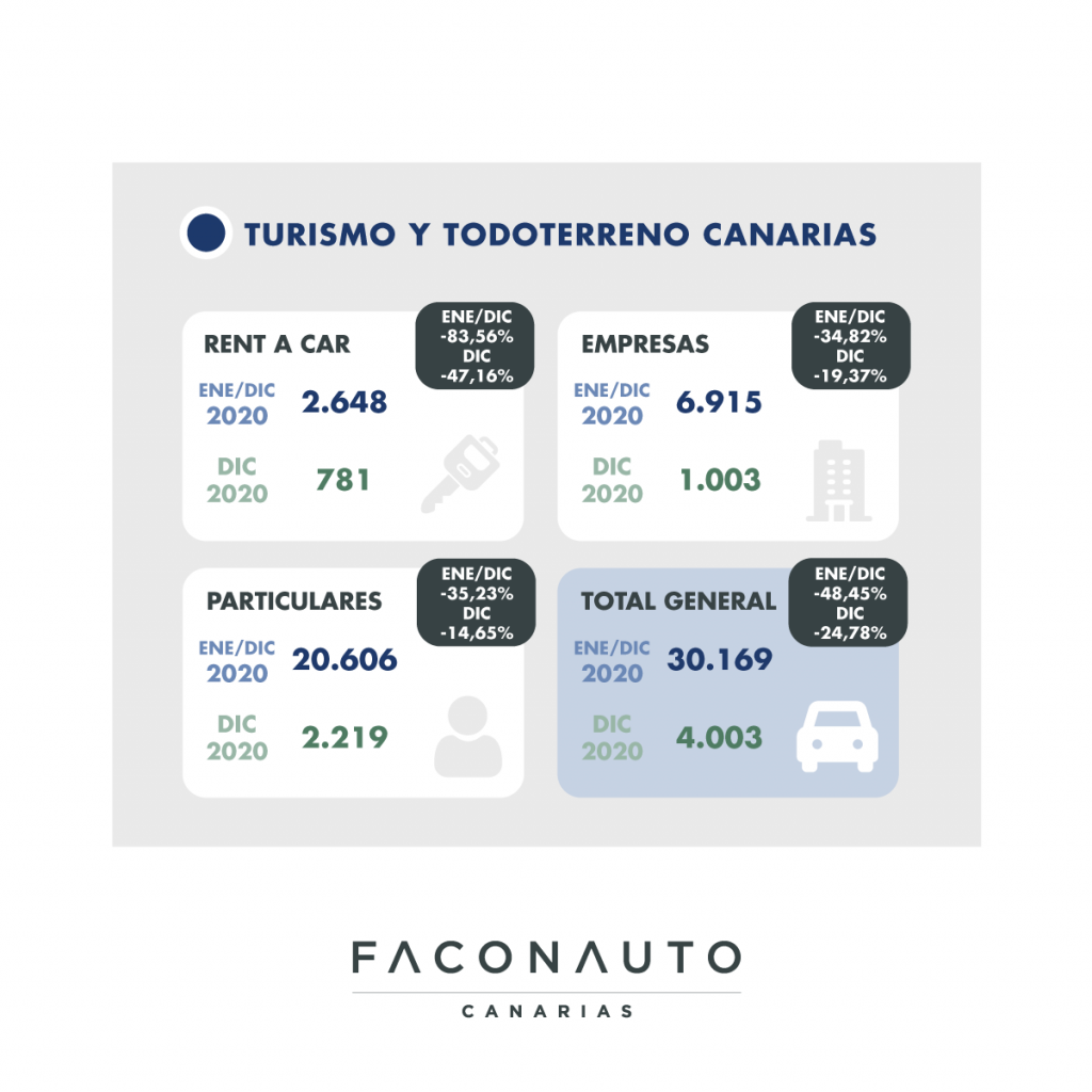 - Durante el 2020, en Canarias se han vendido 30.169 turismos y todoterrenos frente a los 58.527, lo que representa un 48% de caída en este segmento.