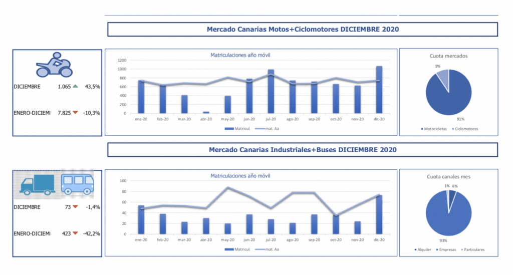 Por lo que respecta a los vehículos comerciales, la caída total a cierre de año es del 36%. Datos negativos también para los vehículos industriales y buses, que han registrado un descenso del 39% con respecto a 2019. El mercado de las dos ruedas, es el que mejor ha resistido la crisis. En diciembre las ventas de motos y ciclomotores aumentaron un 43% con respecto al mismo mes del año pasado. El año se cierra para este subsector con una caída total acumulada del 10% con respecto a 2019.