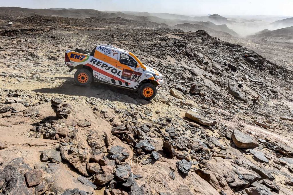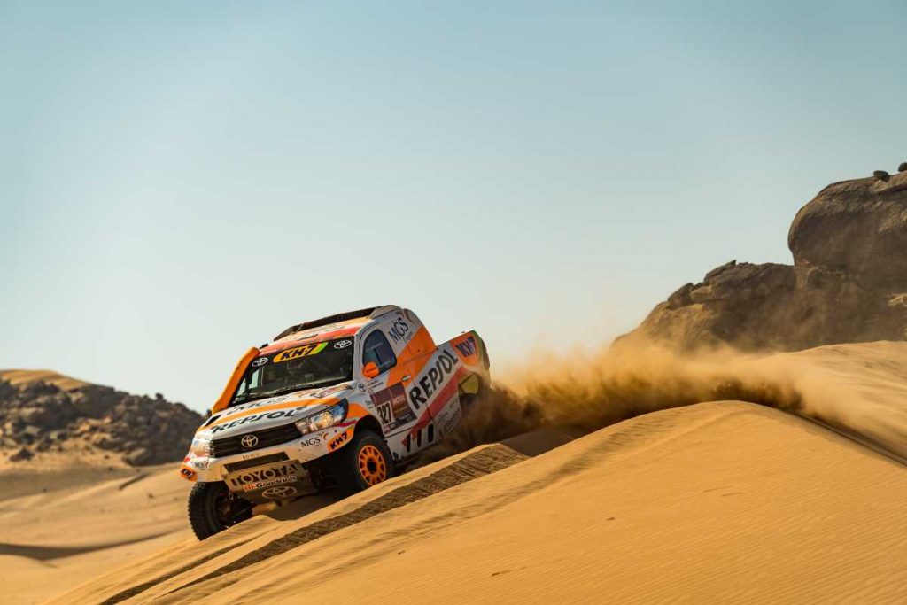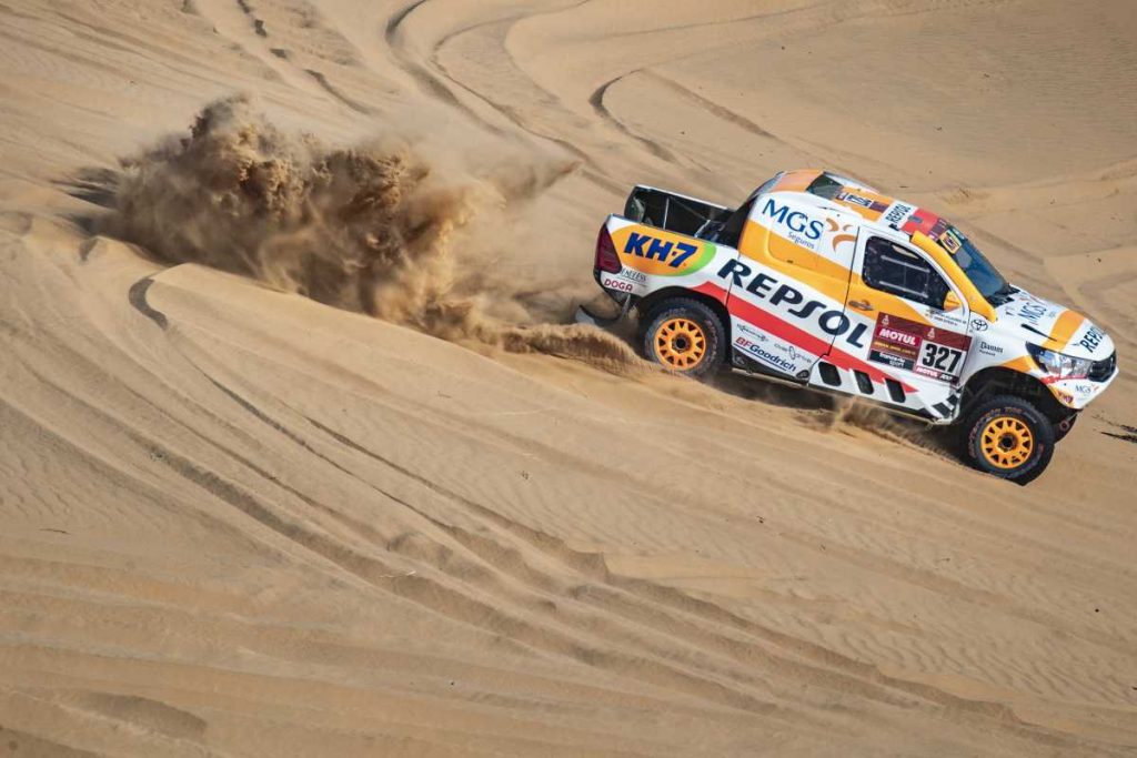 El único contratiempo del día para el Repsol Rally Team se ha producido en la cresta de una duna, donde se han visto obligados a encallar para no colisionar con otro vehículo varado. «Ha sido una lástima porque estábamos pasando todas las dunas a muy buen ritmo. Hoy hemos bajado las presiones de los neumáticos BFGoodrich y el Toyota se ha comportado mucho mejor, tanto en la arena como en las zonas más rápidas», afirmaba el de Oliana, que ha invertido 3h 58’52» en completar la etapa.