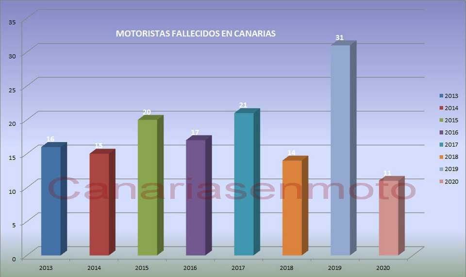 La última víctima del año en Canarias, en lo que a motoristas se refiere, perdió la vida en Fuerteventura el día de San Esteban (26 de diciembre), tras sufrir una caída, según recoge el portal especializado Canariasenmoto.com. Anteriormente fallecieron; un motorista en La Orotava, con dos víctimas más implicadas (21 de noviembre en Tenerife), un motorista al colisionar con un turismo en Granadilla de Abona (20 de noviembre en Tenerife), un motorista tras chocar contra un muro en Santa Cruz de Tenerife (5 de noviembre), un motorista tras sufrir una caída en Tacoronte (22 de julio en Tenerife), otro compañero, también por caída en San Fernando de Maspalomas (4 de julio en Gran Canaria), un motorista en Santa Lucía de Tirajana (23 de junio en Gran Canaria), un motorista en El Risco de Agaete (30 de mayo Gran Canaria), un motorista de 35 años al fufrir una caída en la Salida 16 de la TF-1 en Candelaria (23 de mayo en Tenerife), un motorista tras salirse de la carretera TF-565, en Vilaflor (18 de febrero en Tenerife), y otro compañero tras sufrir un accidente en Telde (3 de febrero en Gran Canaria).
